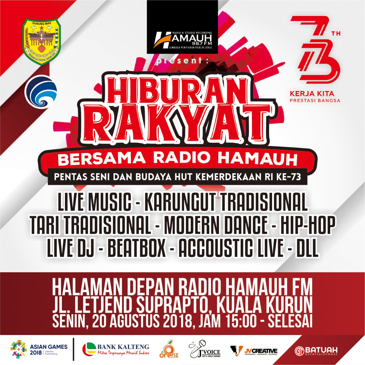 Gunung Mas – Dalam menyemarakan hari Kemerdekaan RI ke-73 dan Energy Of Asia, Asian Games 18 Jakarta-Palembang, maka dengan Ini Pemerintah Kabupaten Gunung Mas akan memeriahkan dengan pesta hiburan rakyat bersama Radio Hamauh, Pentas seni dan Budaya dengan berbagai acara Live music – Karungut tradisional – Tari tradisional – Modern dance – hip hop – Live DJ – beatbox – Acoustic live dan lain lain.