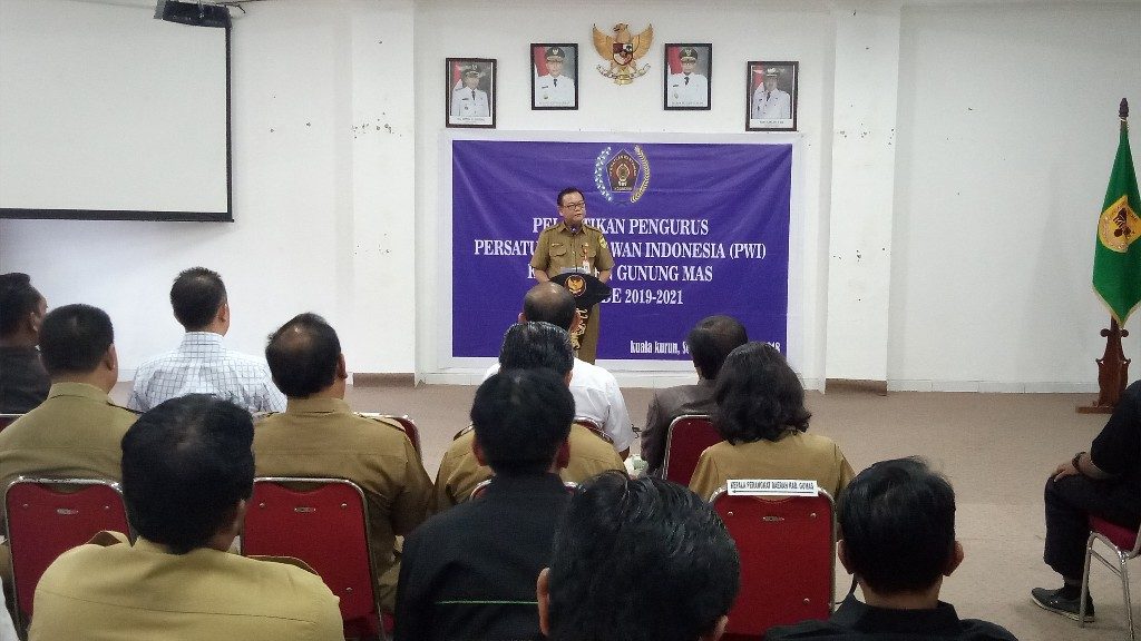 Pelantikan tersebut dilakukan langsung oleh Plt Ketua PWI Provinsi Kalimantan Tengah Sadanggori H.Binti, yang disaksikan oleh, Bupati terpilih periode 2019 – 2024 Jaya S. Monong, Sekretaris Daerah Yansiterson, Kasat Intel Polrest AKP. Tri Prasetyo, Kasi Intel Kajari Henry Elenmoris Tewernnusa, dan Kepala OPD, di aula lantai I Kantor Bupati Gunung Mas, selasa ( 18/12/2018 ).