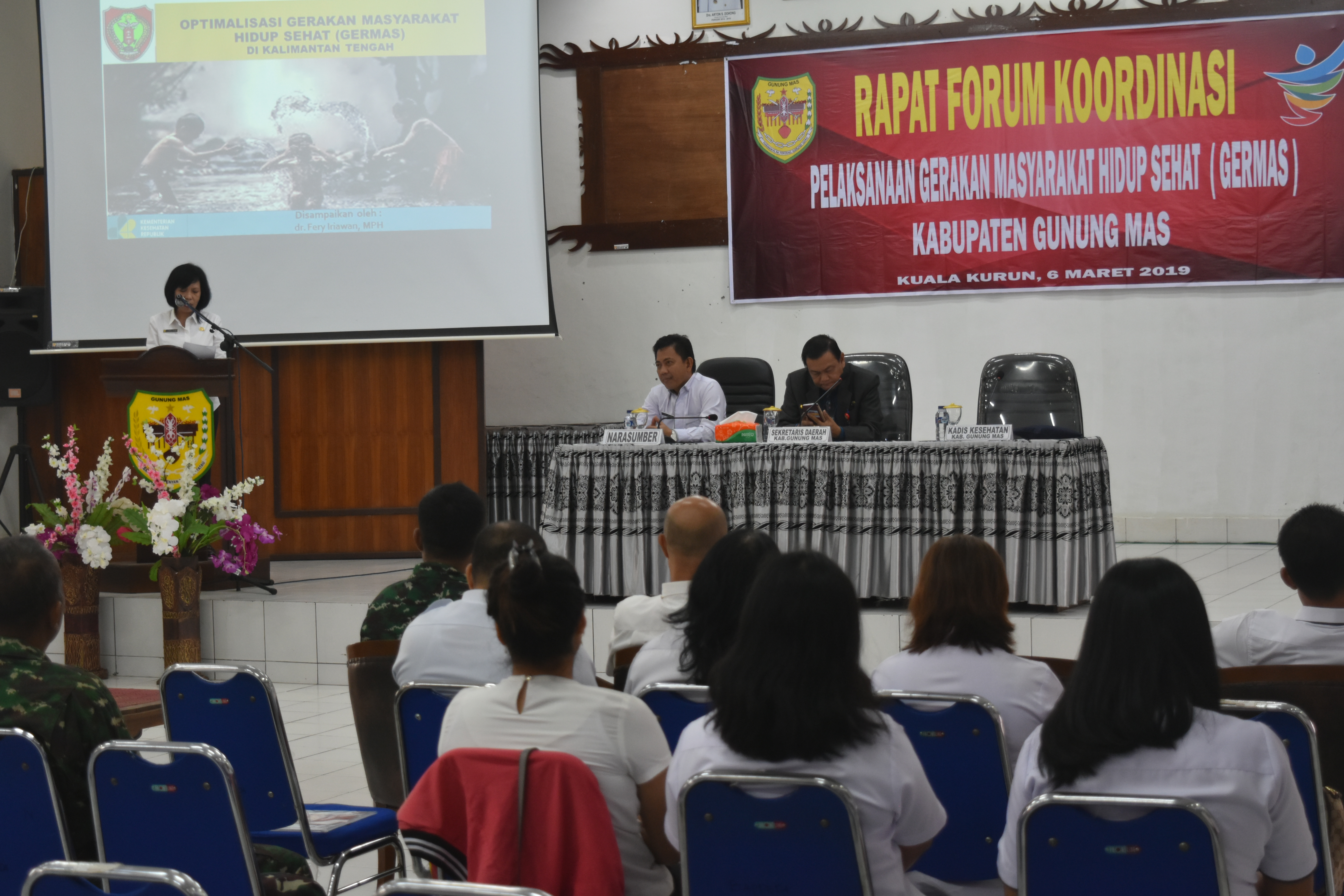 Kepala Dinas Kesehatan dr. Maria Efianti menyampaikan, “Kabupaten Gunung Mas terpilih sebagai Kabupaten GERMAS. Kegiatan yang dilaksanakan hari ini, merupakan langkah awal untuk melaksanakan gerakan masyarakat hidup sehat. Semua komponen yang terlibat dalam Forum koordinasi nantinya akan bekerja bersama-bersama dalam pelaksanaan GERMAS”, imbuhnya.