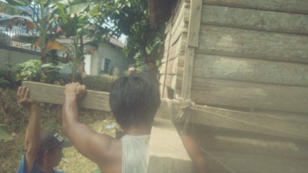 Rabu (20/3/2019) rumah tersebut diangkat oleh sekitar seratus orang dengan jarak sekitar seratus meter atau lebih dan tentunya membutuhkan tenaga yang lebih ekstra untuk mengangkat rumah yang berat. Turut ikut serta anggota TNI dan anggota dari TAGANA dan masayarakat sekitar.