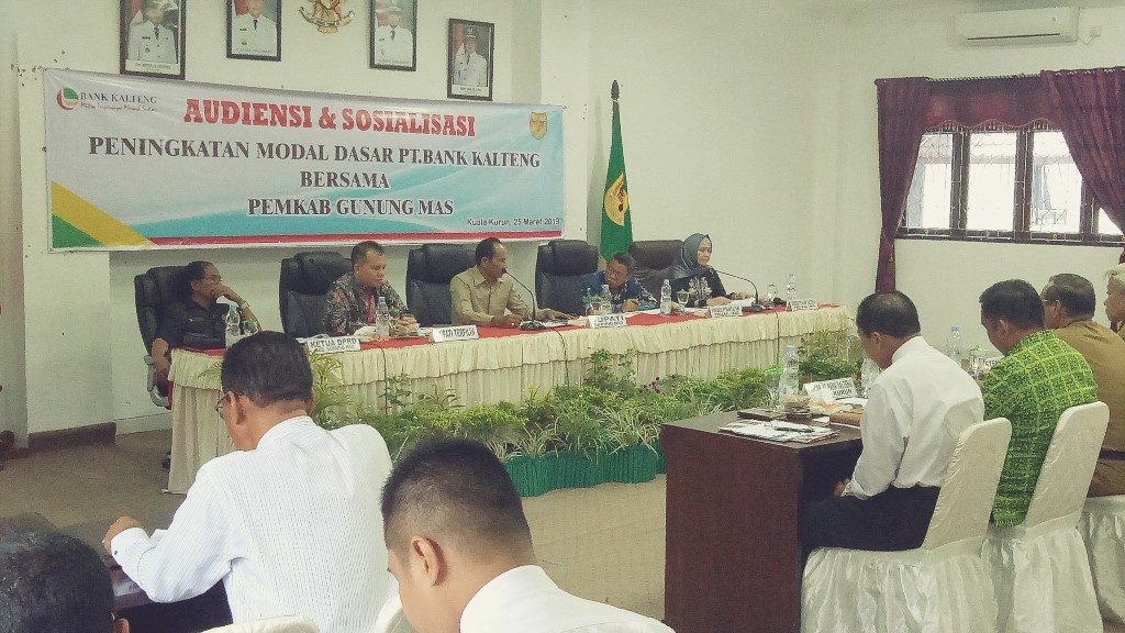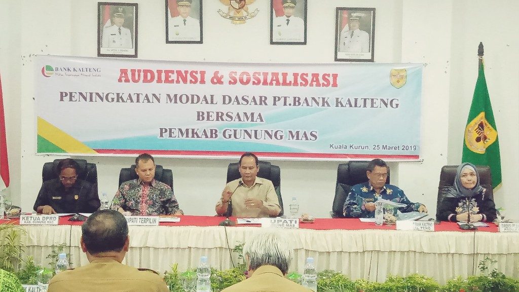 Gunung Mas – PT Bank Kalteng Kabupaten Gunung Mas ( Gumas ) gelar kegiatan Audiensi dan Sosialisasi peningkatan modal dasar PT. Bank Kalteng bersama Pemerintah Kabupaten Gunung Mas. Kegiatan dibuka oleh Bupati Gunung Mas yang didampingi Bupati terpilih 2019-2023 Jaya S. Monong dihadiri Asisten II Setda, beberapa kepala SOPD dan pihak Bank Kalteng , yang dilaksanakan di aula lantai I Kantor Bupati senin (25/3/2019).