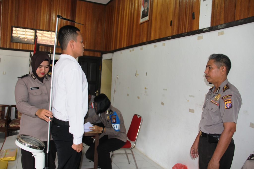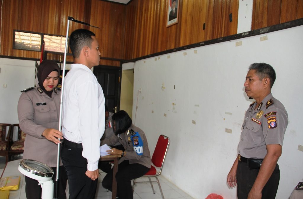 UKUR : Kabag Sumda Polres Gumas Kompol Surya Fahmi bersama tim dokkes mengukur berat dan tinggi badan pendaftar calon anggota polri, di Aula Bhayangkari Polres setempat, Rabu (27/3) pagi.