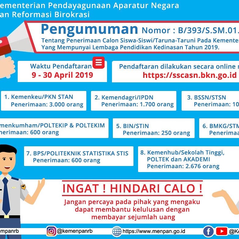 Pemerintah kembali membuka penerimaan calon siswa-siswi/taruna-taruni pada lembaga pendidikan kedinasan sebagai salah satu jalur seleksi Calon Pegawai Negeri Sipil (CPNS). Seperti tahun lalu, ada 19 pendidikan tinggi kedinasan di 8 kementerian/lembaga yang membuka kesempatan bagi generasi muda yang memenuhi syarat untuk mengikuti seleksi. Untuk tahun ini, dibuka 9.176 kursi calon siswa-siswi/taruna-taruni. Adapun waktu pendaftaran pada tanggal 9-30 April 2019.