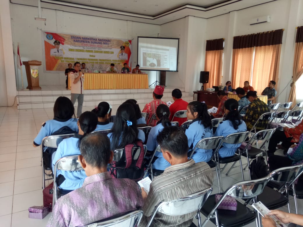 Sebagai narasumber pada sosialisasi tersebut, ketua BNNK Gunung Mas Rony Karlos, Kepala Seksi Pidana Umum Kejari Gumas Mohammad Hamidun Noor, Kasat Narkoba Polres Gumas Iptu Damlias