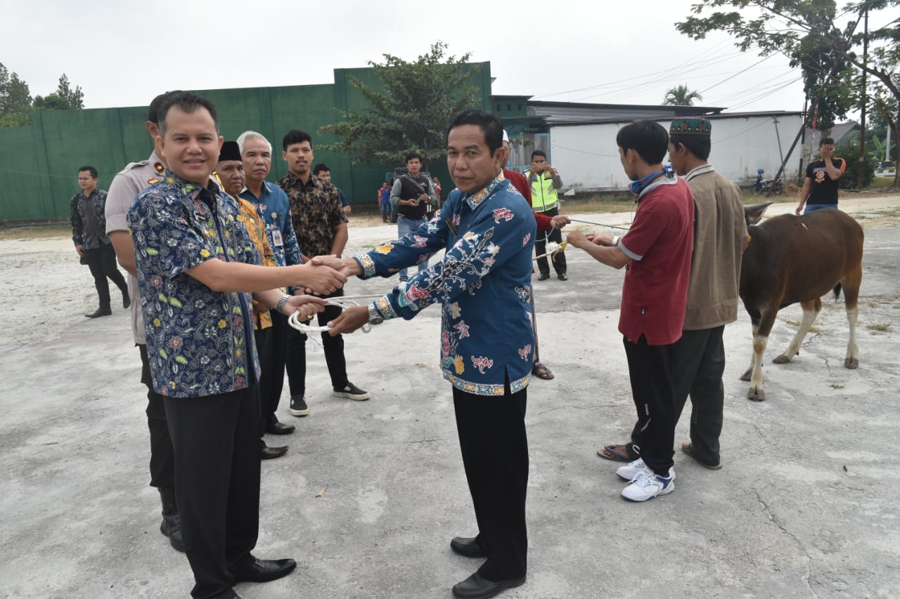 Kuala Kurun – Pemerintah Kabupaten Gunung Mas, melaksanakan penyerahan hewan kurban dalam hal ini Bupati Gunung Mas Jaya S. Monong, SE., M.Si secara langsung menyerahkan 4 ekor sapi kepada ketua Dewan Masjid Indonesia Kabupaten Gunung Mas Drs. Muhamad Rusdi bertempat di Masjid Agung Darul Najah Kuala Kurun, Jumat (9/8/2019).