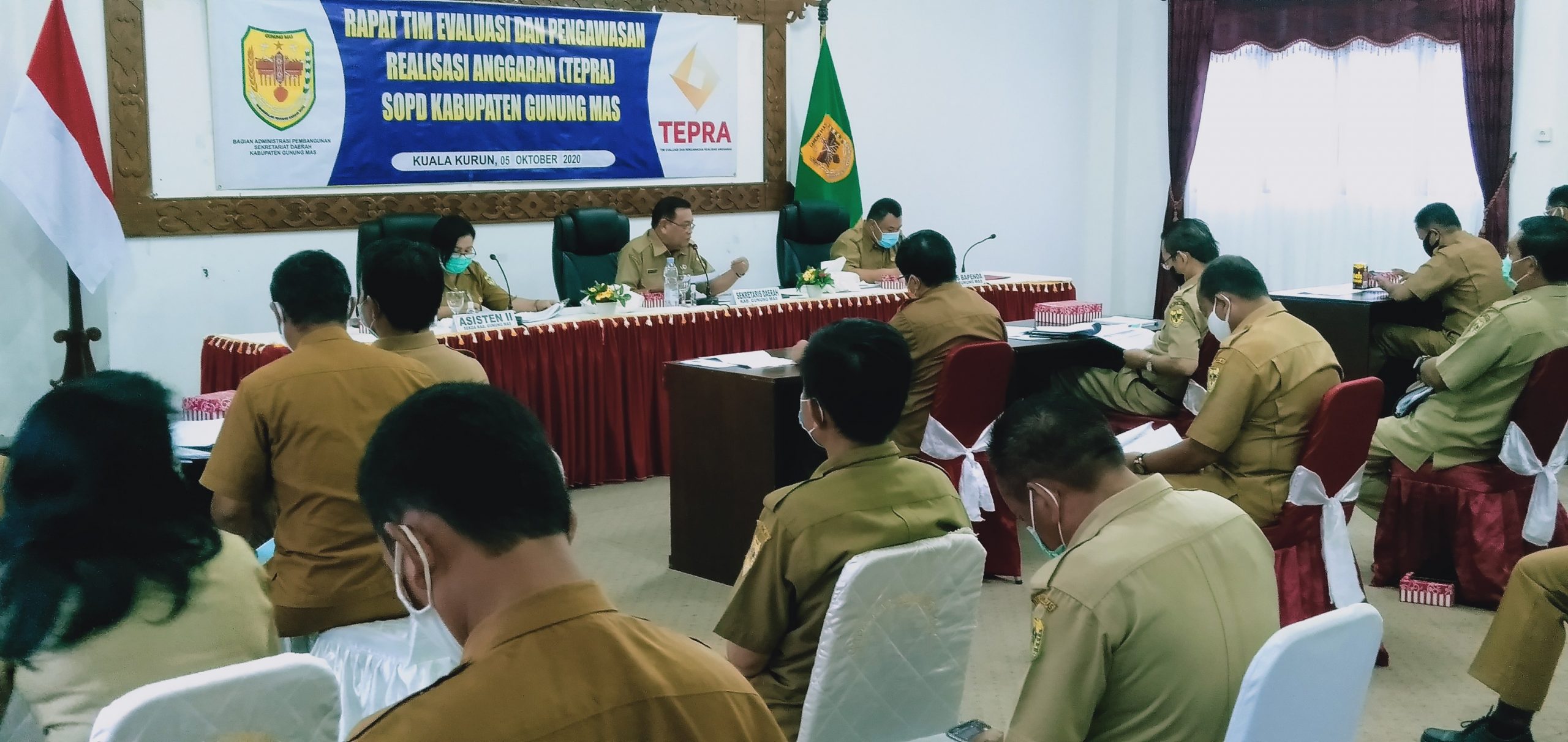 Gunung Mas – Sekretaris Daerah Kabupaten Gunung Mas ( Gumas ) Yansiterson memimpin rapat Tim Evaluasi dan Pengawasan Realisasi Anggaran (Tepra) Program dan kegiatan APBD Tahun 2020 di Aula lantai I kantor Bupati Gunung Mas, senin (5/10/2020) pagi.