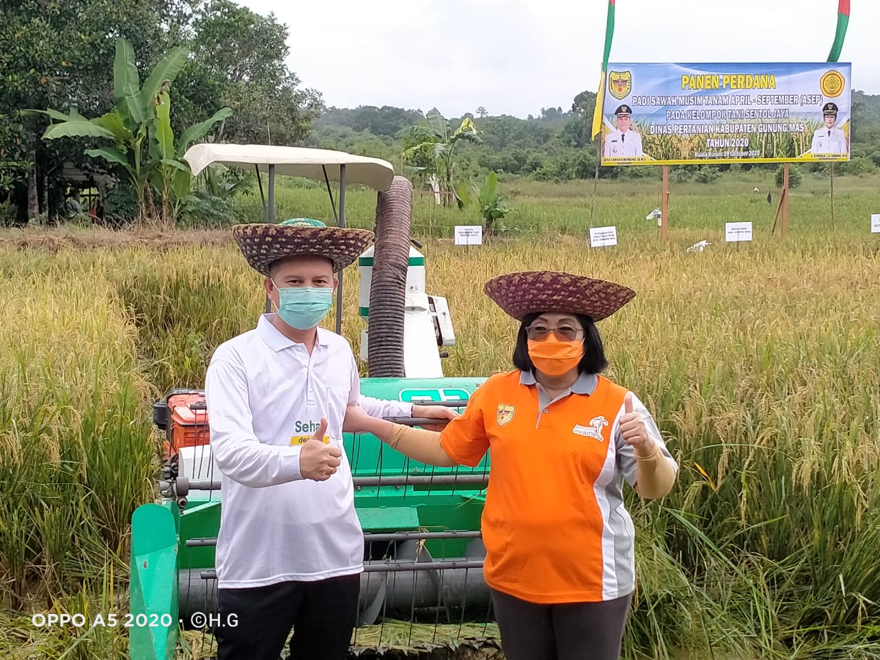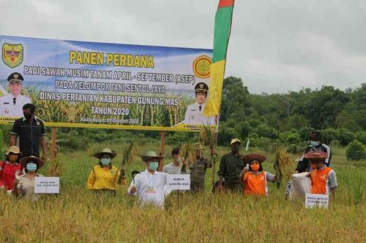 KUALA KURUN MMC.gunungmaskab– Bupati Gunung Mas Jaya Samaya Monong dan wakil Bupati Efrensia LP Umbing menghadiri dalam aktivitas panen Perdana padi sawah musim tanam April  – September yang bertempat di Lahan kelompok Tani Sentol Jaya Kelurahan Tampang Tumbang Anjir, Jumat (9/10/2020).