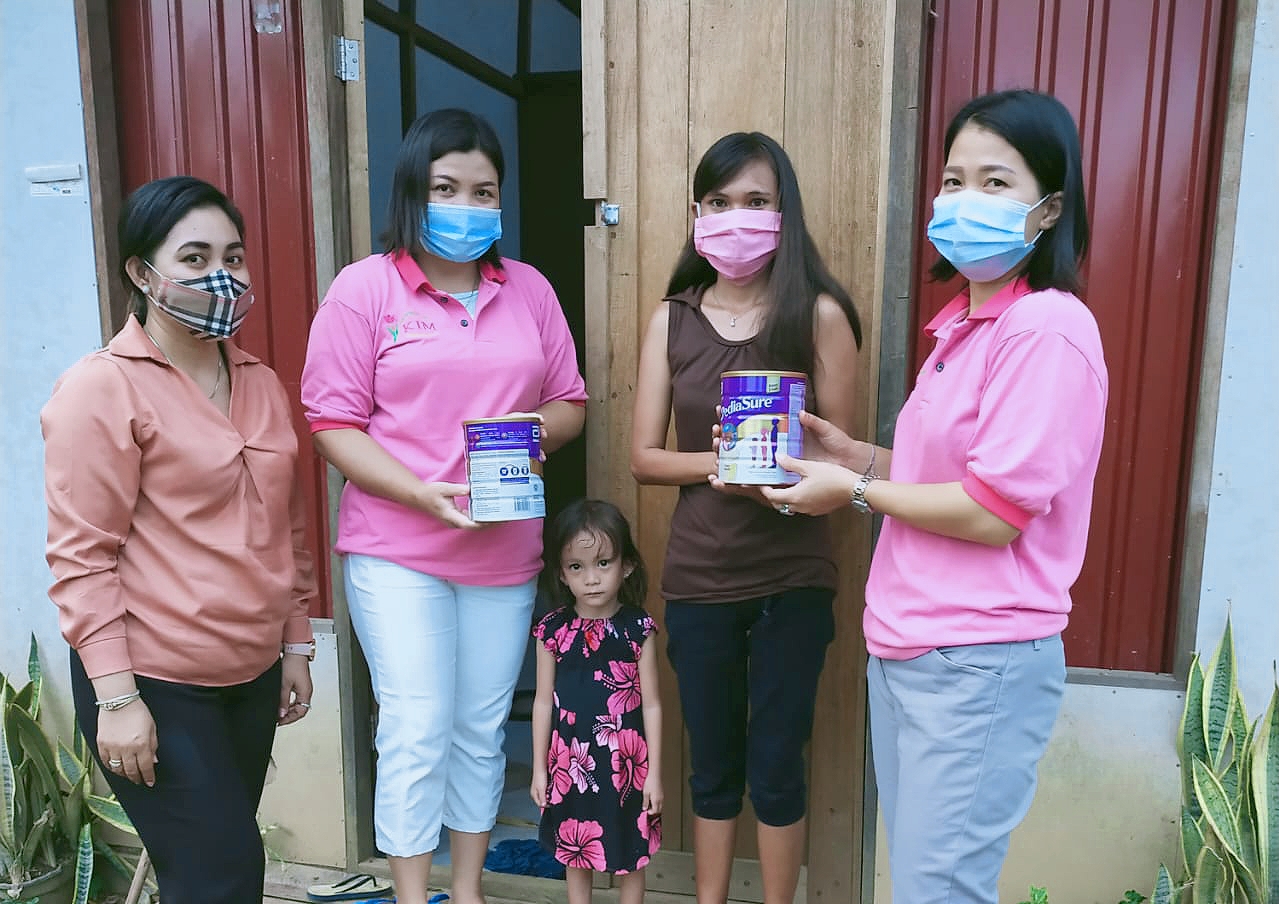 Foto : KIM Gumas : Sekretaris KIM Gumas Ribka didampingi anggota Novi dan Karolina Defran saat menyerahkan bantuan susu kepada orangtua anak penderita bocor jantung.