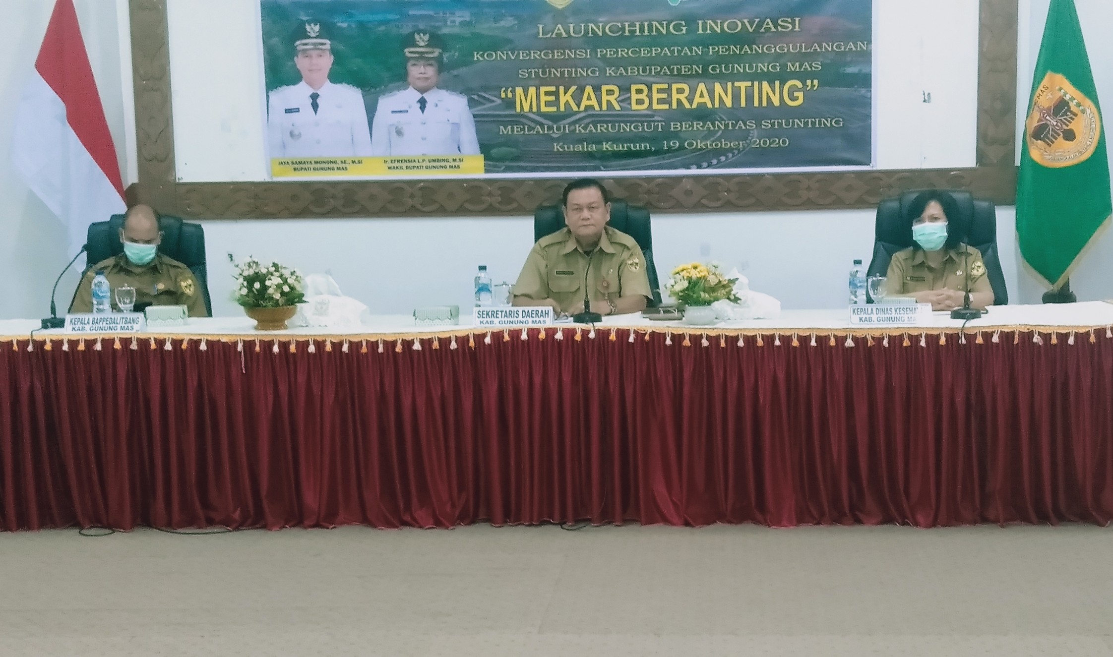 Gunung Mas – Sekretaris daerah Kabupaten Gunung Mas (Gumas) yansiterson dengan dengan resmi membuka kegiatan launching inovasi konvergensi percepatan penanggulangan stunting Kabupaten Gunung Mas ” Mekar Beranting” melalui karungut berantas stunting yang dilaksanakan di aula lantai I kantor Bupati Gunung Mas, Senin (19/10/2020) siang.