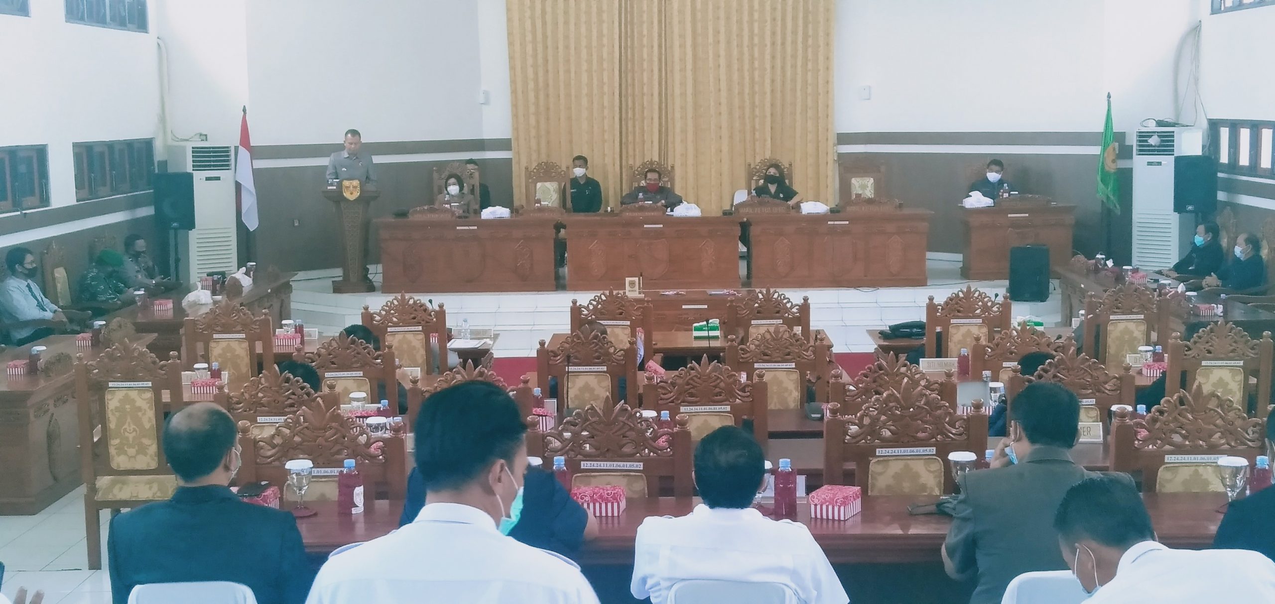 Gunung Mas – Rapat sidang paripurna tahun 2020 tentang peyampaian Pidato Pengantar Nota Keuangan dan Rancangan Anggaran Pendapatan dan Belanja Daerah Kabupaten Gunung Mas Tahun Anggaran 2021 oleh Bupati Gunung Mas Jaya Samaya Monong.
