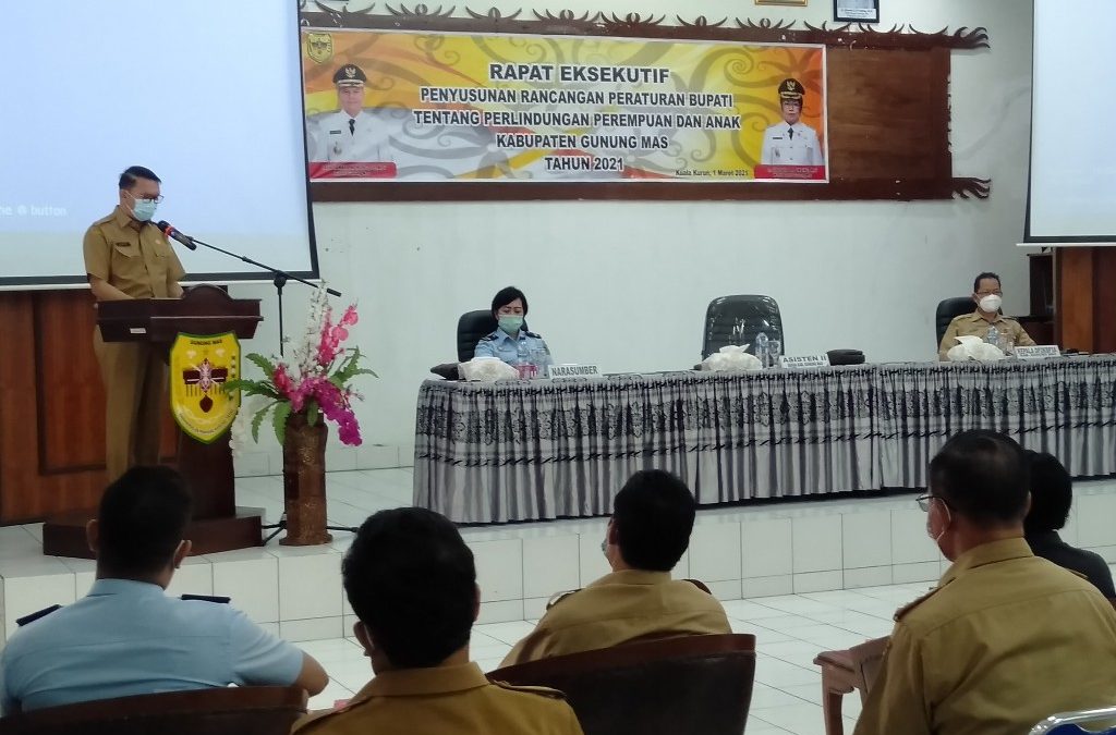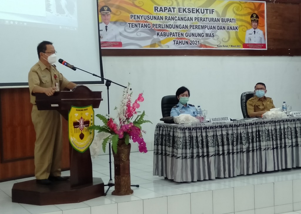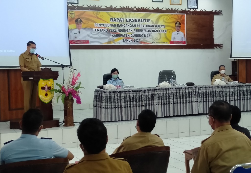 Kuala Kurun – Bupati Gunung Mas (Gumas) yang diwakili Asisten Perekonomian dan Pembangunan Sekretariat Daerah, Richard F.L, Membuka Kegiatan, Eksekutif Penyusunan Rancangan Peraturan Bupati, tentang perlindungan perempuan dan anak, tahun 2021. Kegiatan dilaksanakan di aula Bappedalitbang, pada Senin ( 01/03/2021).