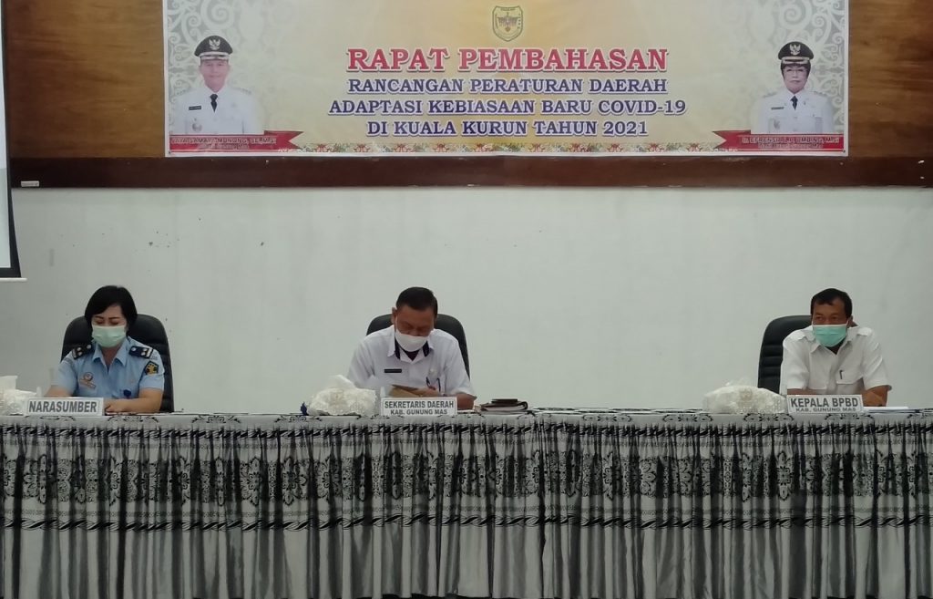 Kuala Kurun – Bupati Gunung Mas, (Gumas), yang diwakili Sekretaris Daerah, Yansiterson, membuka rapat Pembahasan Naskah Akademis dan Rancangan Peraturan Daerah (Raperda) Protokol Kesehatan Adaptasi Kebiasaan Baru Covid 19, yang dilaksanakan di aula Bappedalitbang, pada rabu (21/4/2021).