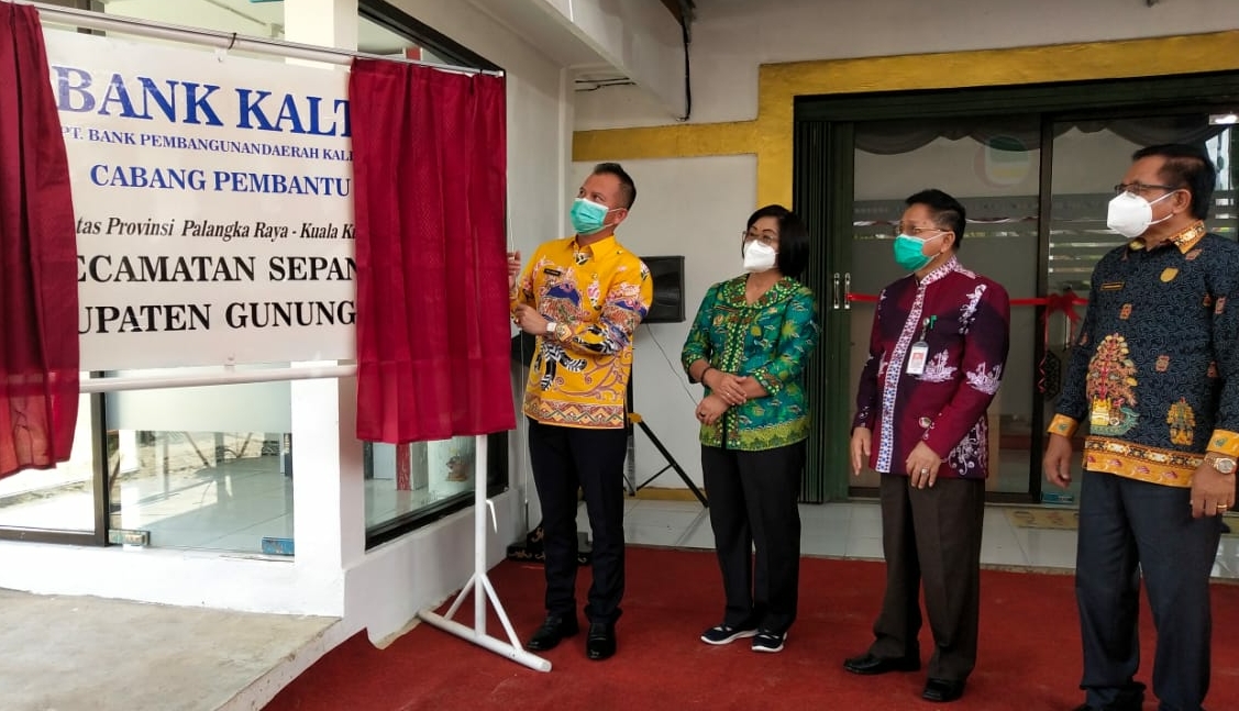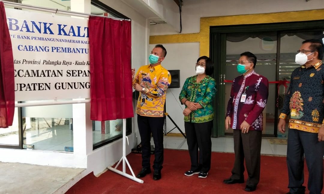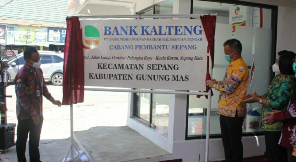 Kuala Kurun – Peresmian Kantor Cabang Pembantu (KCP) Bank Kalteng Sepang Diresmikan langsung oleh Bupati Gunung Mas, Jaya Samaya Monong, ditandai dengan penarikan tirai papan kantor Bank Kalteng CP Sepang, Kamis (20/5/2021).