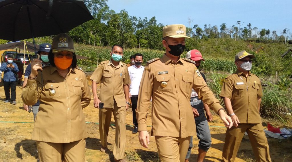 Kuala Kurun – Bupati Gunung Mas (Gumas) Jaya Samaya Monong bersama Wakil Bupati Gumas Efrensia L.P Umbing melakukan panen jagung hibrida di lahan Kelompok Tani Sejahtera, Kecamatan Kurun, Senin (13/12/2021).