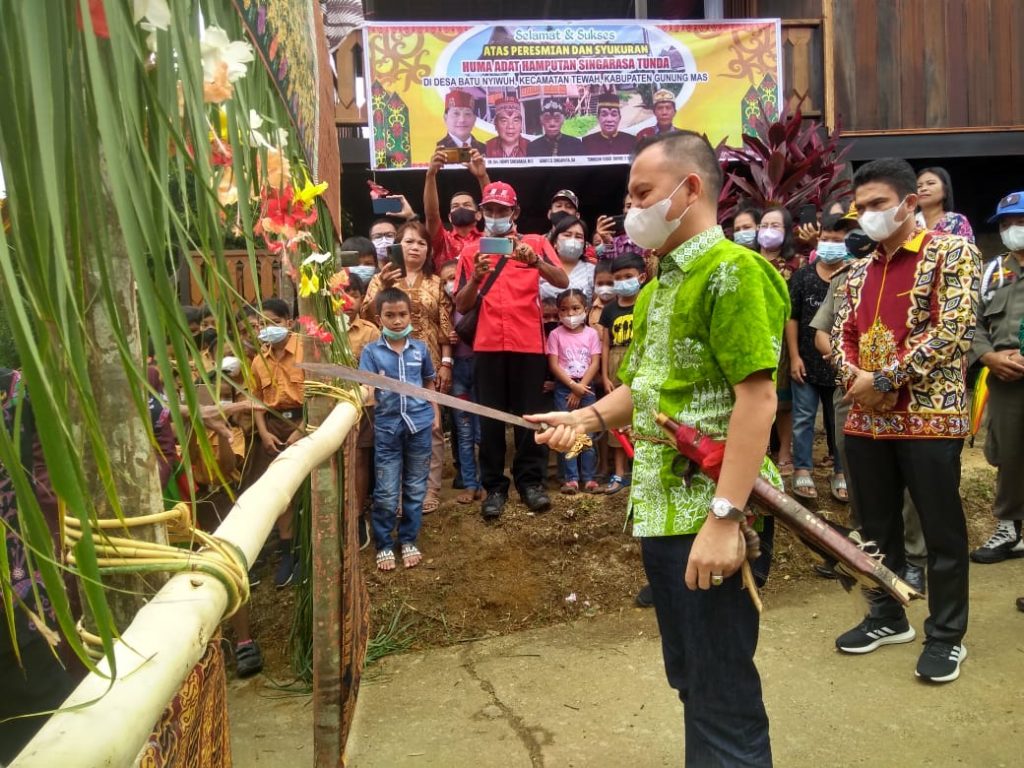 Kuala kurun – Bupati Gunung Mas (Gumas) Jaya Samaya Monong didampingi Wakil Bupati Efrensia L.P Umbing meresmikan Huma Adat Hamputan Singarasa Tunda, di Desa Batu Nyiwuh, Kecamatan Tewah, Sabtu (05/03/2022).