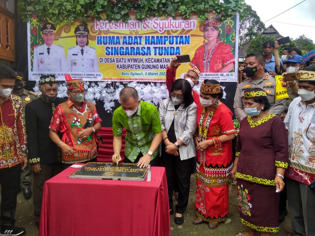 Kuala kurun – Bupati Gunung Mas (Gumas) Jaya Samaya Monong didampingi Wakil Bupati Efrensia L.P Umbing meresmikan Huma Adat Hamputan Singarasa Tunda, di Desa Batu Nyiwuh, Kecamatan Tewah, Sabtu (05/03/2022).