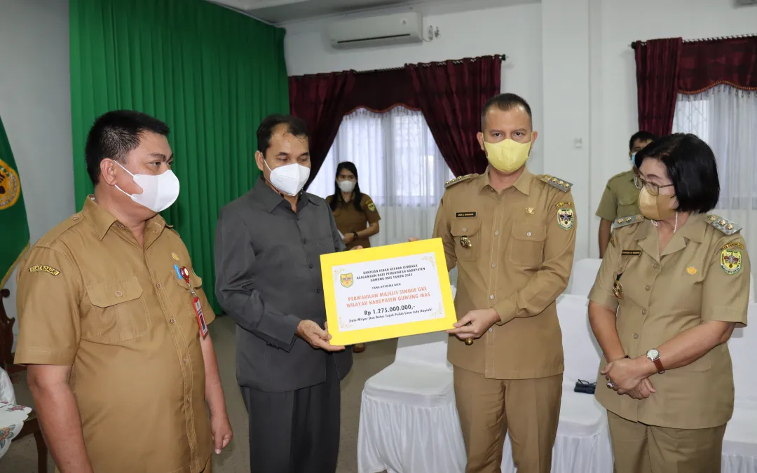 Kuala Kurun – Bupati Gunung Mas Jaya Samaya Monong menyerahkan bantuan Hibah kepada Lembaga Keagamaan dari Pemerintah Daerah Kabupaten Gunung Mas Tahun 2022 di ruang rapat lantai 1 kantor Bupati Gumas, Selasa (5/4/2022).