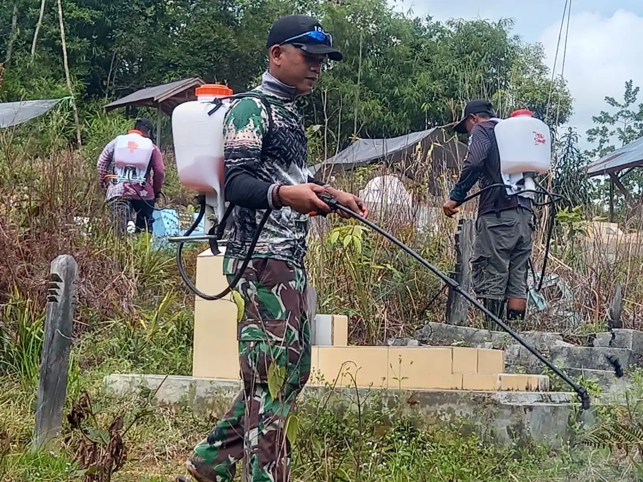 Kuala Kurun – Menjelang Bulan Suci Ramadhan / Bulan Puasa, Babinsa Koramil 1016-05/Rungan Peltu Jimo dan Praka Nopri bersama warga masyarakat melaksanakan kerja bakti pembersihan Tempat Pemakaman Umum (TPU) di Desa Tumbang Jutuh Kecamatan Rungan Kabupaten Gunung Mas, Jumat (1/4/2022)