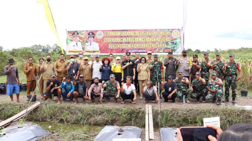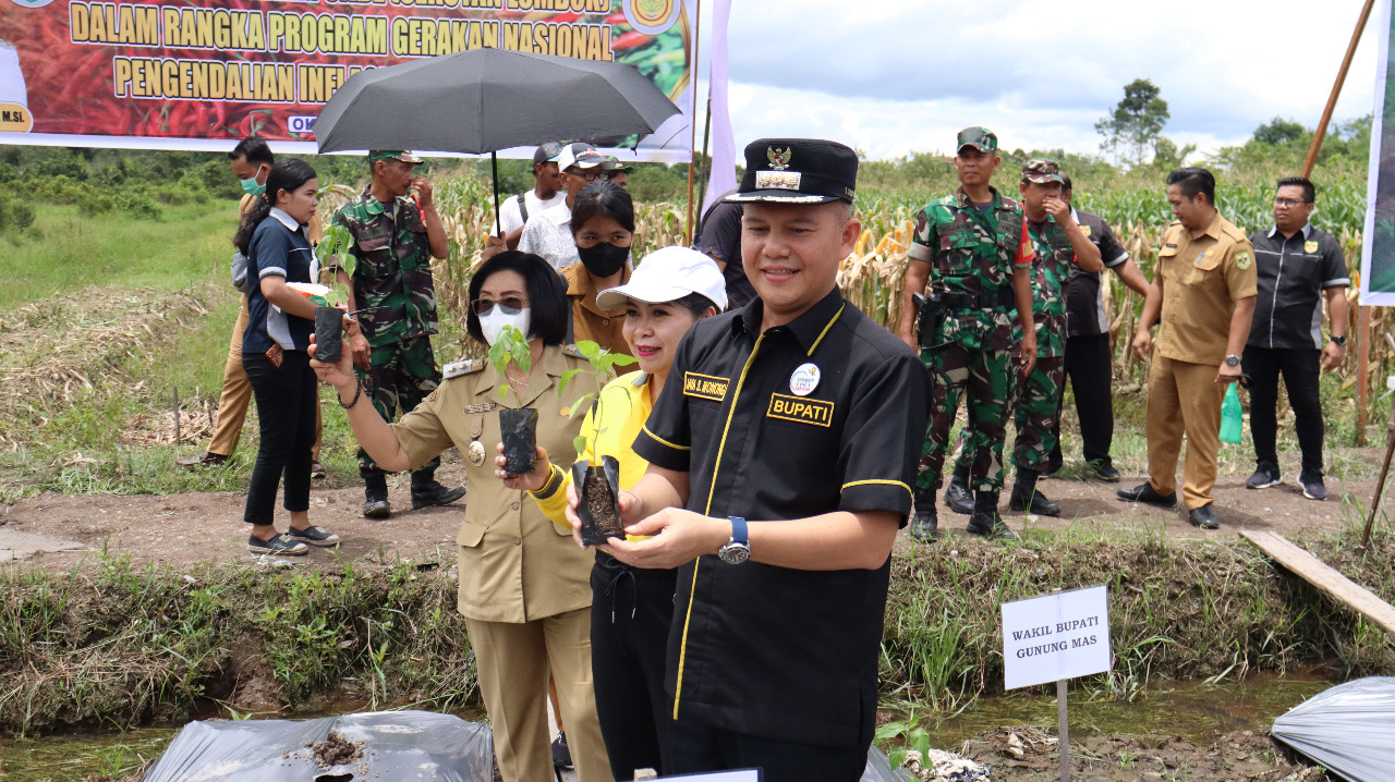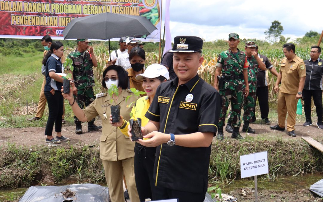 Kuala Kurun – Bupati Gunung Mas (Gumas) Jaya Samaya Monong bersama Wakil Bupati Efrensia L.P Umbing dan Forum Koordinasi Pimpinan Daerah (FORKOPIMDA) melaksanakan kegiatan Gerakan Menanam Cabe (Sakuyan Lombok) dalam rangka Gerakan Pengendalian Inflasi Pangan (GNPIP) di Kuala Kurun, Senin (04/10/2022).