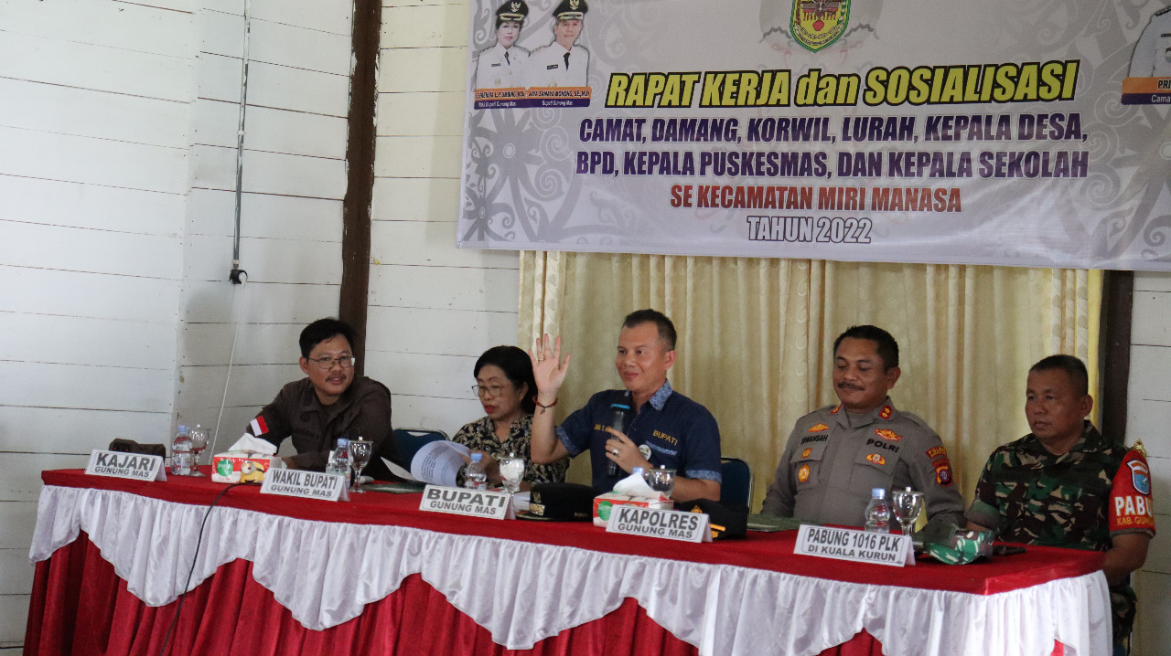 mmc.gunungmaskab.go.id – Pemerintah Kabupaten Gunung Mas (Gumas) bersama unsur Forkopimda menghadiri Kegiatan Rapat Kerja dan Sosialisasi Camat, Damang, Korwil, Lurah, Kepala Desa, BPD, Kepala Puskesmas dan Kepala Sekolah se-Kecamatan Miri Manasa Tahun 2022.
