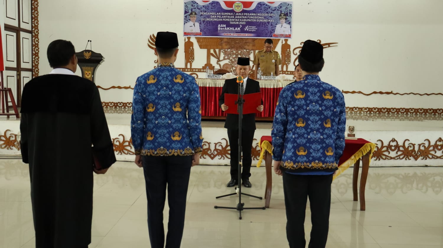 mmc.gunungmaskab.go.id – Kuala Kurun – Bupati Gunung Mas (Gumas) Jaya Samaya Monong melakukan pengambilan Sumpah / Janji Pegawai Negeri Sipil (PNS) dan melantik Pejabat Fungsional dilingkungan Pemerintah Kabupaten Gunung Mas, yang dilaksanakan di GPU Damang Batu, Senin (27/2/2023).