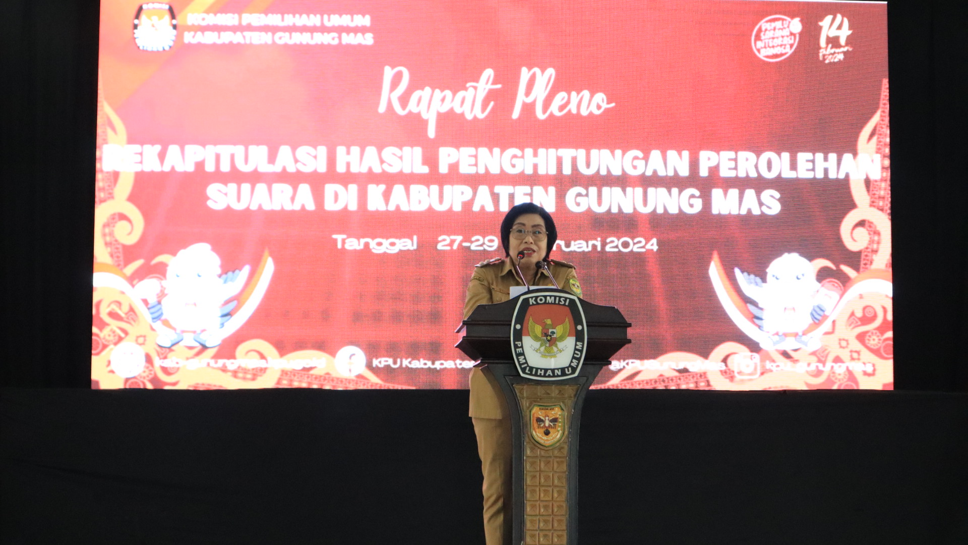 Wakil Bupati Gunung Mas (Gumas), Efrensia L.P Umbing bersama Forkopimda, menghadiri Rapat Rekapitulasi Hasil Penghitungan Perolehan Suara di Tingkat Kabupaten Gunung Mas. Rapat ini digelar oleh Komisi Pemilihan Umum (KPU) Kab. Gumas yang dilaksanakan di Gedung Pertemuan Damang Batu, Selasa (27/02/2024).