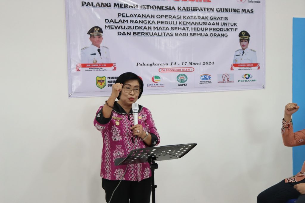 Sementara itu Ketua Panitia PMI Bakti Sosial operasi Katarak, dr. Waltiana menyampaikan bahwa PMI peduli kemanusiaan untuk mewujudkan mata sehat, hidup produktif dan berkualitas bagi semua orang dan tujuannya adalah meningkatkan kualitas hidup masyarakat miskin dan rentan, dalam menjalankan aktivitas kesehariannya, terkhusus warga Kabupaten Gunung Mas.