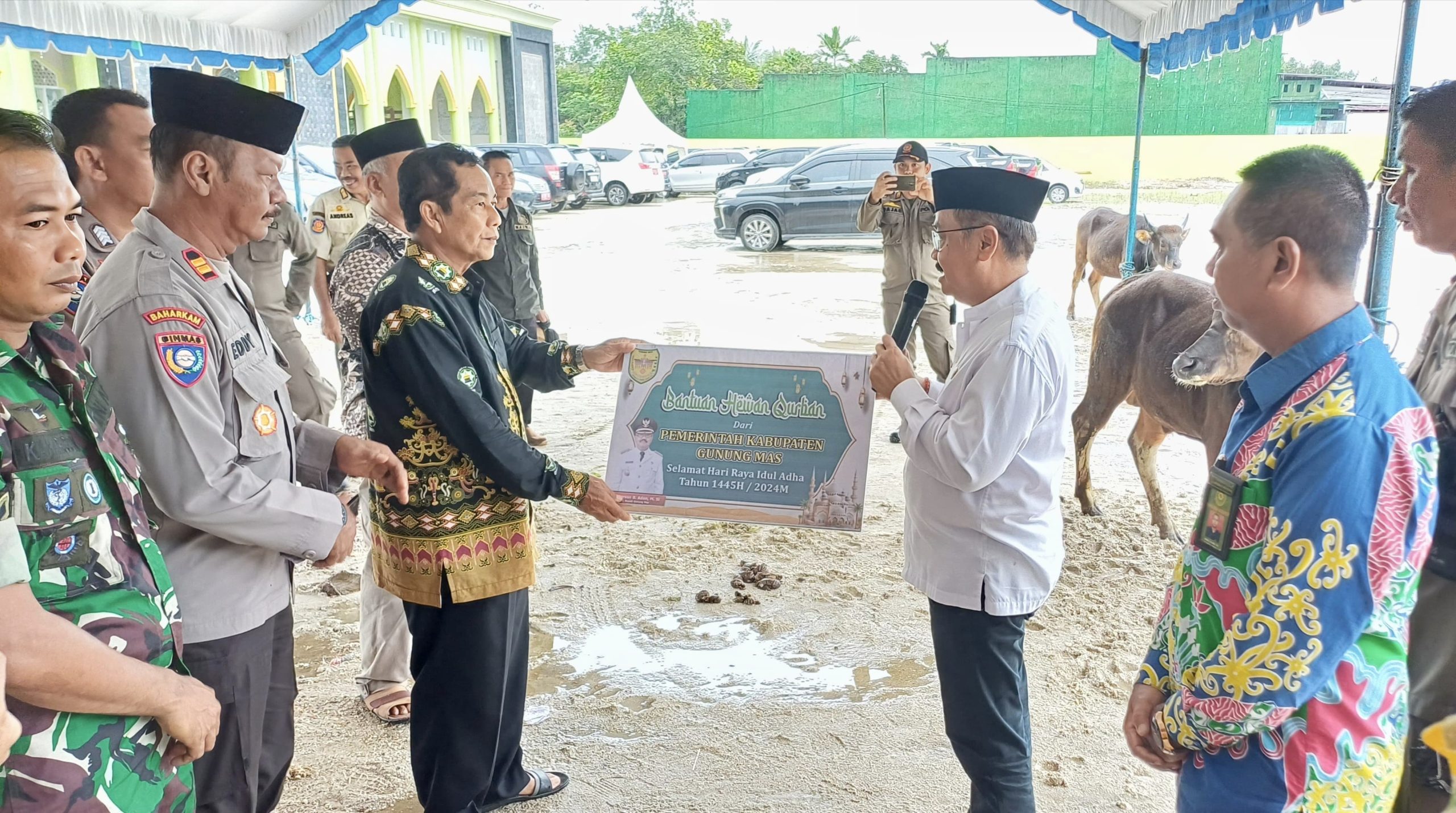 Penjabat (Pj) Bupati Gunung Mas (Gumas), Herson B. Aden, menyerahkan secara simbolis bantuan hewan kurban kepada Dewan Masjid Kab. Gumas, bertempat di Halaman Masjid Agung Darun Najah Kuala Kurun, Kamis (13/06/2024).
