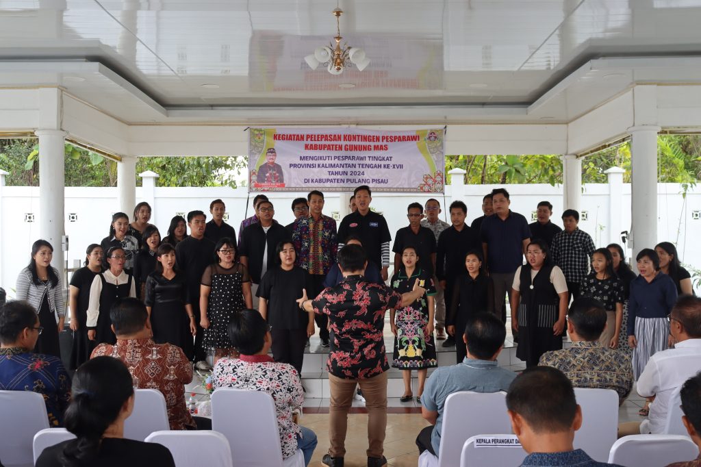 Penjabat (Pj) Bupati Gunung Mas (Gumas), Herson B. Aden, melepas kontingen Paduan Suara Gerejawi (Pesparawi) kab. Gumas untuk mengikuti pesta Pesparawi ke-XVII Tingkat Provinsi Kalimantan Tengah (Kalteng) di Kabupaten Pulang Pisau (Pulpis) Tahun 2024 yang akan dilaksanakan pada tanggal 28 Juni sampai dengan 4 Juli Tahun 2024, kegiatan pelepasan kontingen Pesparawi Kab. Gumas ini bertempat di Pendopo Rumah Jabatan Bupati Gumas, Sabtu (22/06/2024).