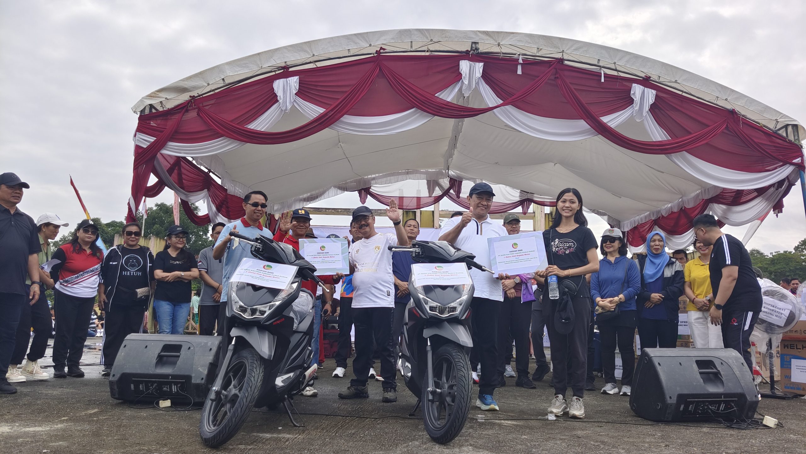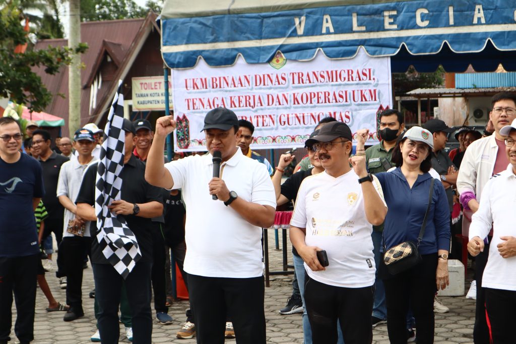 Wakil Gubernur (Wagub) Kalimantan Tengah (Kalteng), Edy Pratowo, dan Penjabat (Pj) Bupati Gunung Mas (Gumas), Herson B. Aden, menghadiri kegiatan Jalan Sehat dalam rangka Hari Jadi ke-67 Prov. Kalteng dan Hari Jadi ke-22 Kab. Gumas, yang bertempat di Taman Kota Kuala Kurun, Sabtu (22/06/2024).
