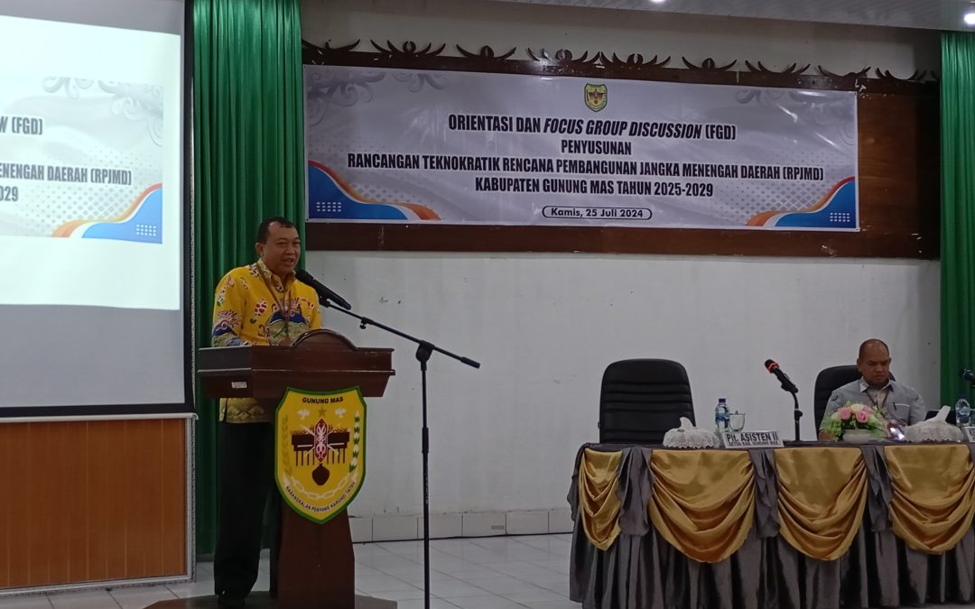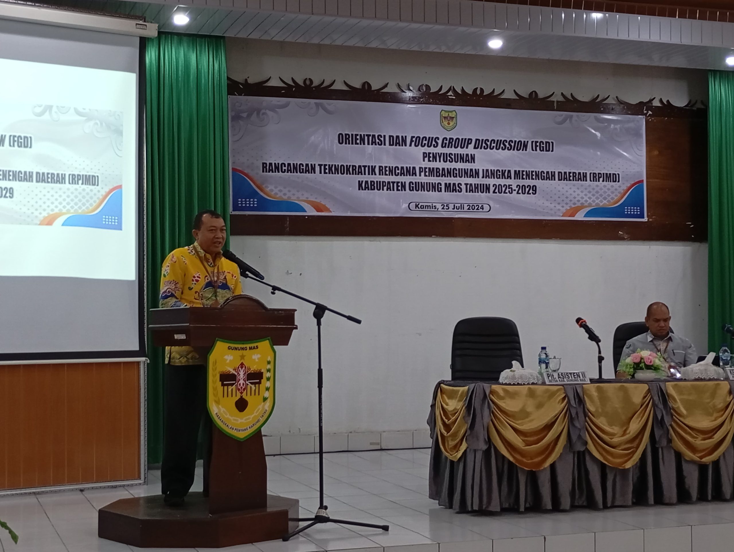 MMCGumas – Kuala Kurun – Pemerintah Kabupaten (Pemkab) Gunung Mas (Gumas) melalui Badan Perencanaan Pembangunan Riset dan Inovasi Daerah (Bapperida) menggelar kegiatan Orientasi dan Focus Group Discussion (FGD) Penyusunan Rancangan Teknokratik Rencana Pembangunan Jangka Menengah Daerah (RPJMD) Kabupaten Gunung Mas Tahun 2025-2029 yang dilaksanakan di Aula Bapperida, Kamis (25/07/2024).