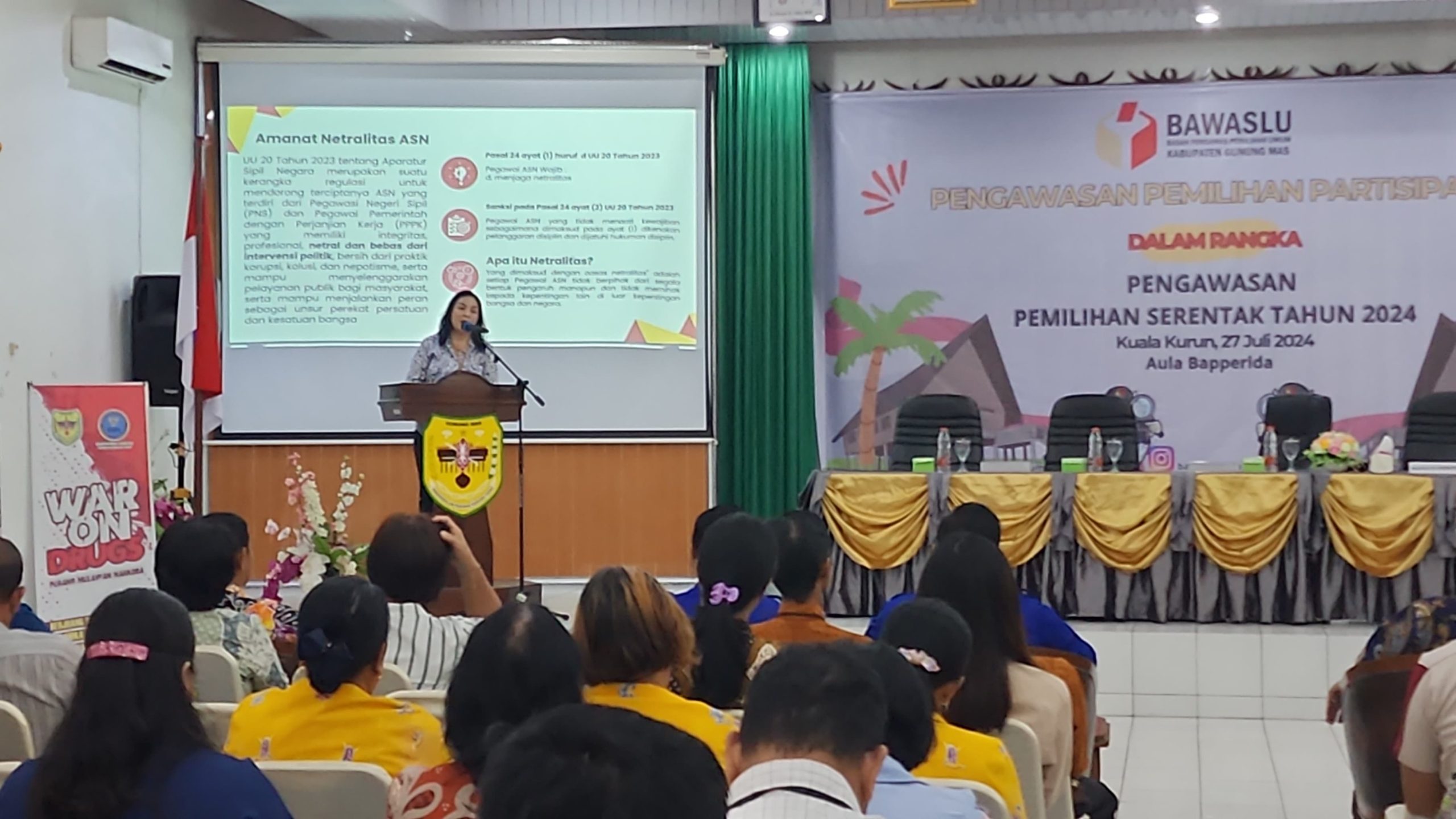 MMCGumas – Kuala Kurun – Plt. Kepala Badan kepegawaian dan Pengembangan Sumber Daya Manusia (BKPSDM) Kabupaten Gunung Mas (Gumas), Kristening Natalina, menjadi narasumber dalam kegiatan Sosialisasi Pengawasan Pemilihan Partisipatif pada Pemilihan Serentak Tahun 2024 bertempat di Aula Bapperida Gumas, Sabtu (27/07/2024).