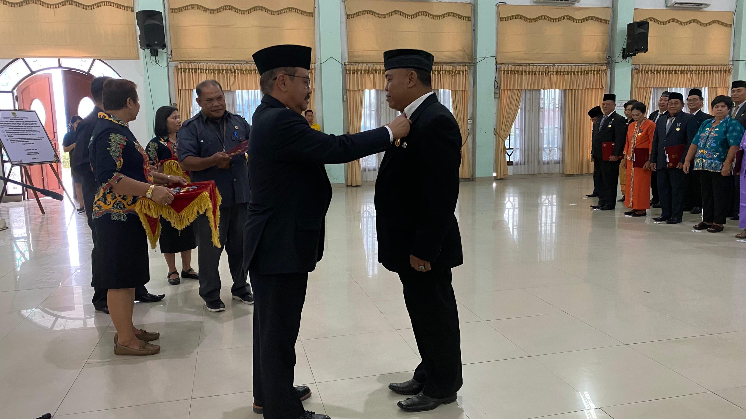 MMCGumas – Kuala Kurun – Penjabat (Pj) Bupati Gunung Mas (Gumas), Herson B. Aden, menyematkan Tanda Kehormatan Satyalancana Karya Satya 10, 20 dan 30 tahun bagi 201 orang Pegawai Negeri Sipil (PNS) di Lingkungan Pemerintah Kabupaten (Pemkab) Gumas Tahun 2024 yang dilaksanakan di GPU Damang Batu, Kamis (15/08/2024).
