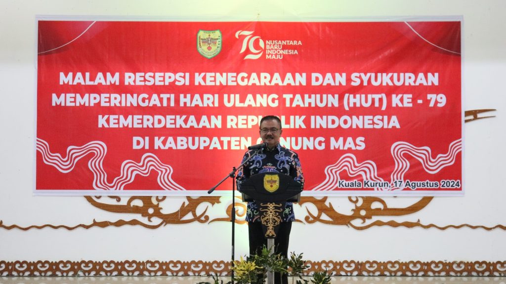 MMCGumas – Kuala Kurun – Penjabat (Pj) Bupati Gunung Mas (Gumas), Herson B. Aden, menghadiri Acara Malam Resepsi Kenegaraan HUT ke-79 Kemerdekaan RI Tahun 2024 yang digelar di GPU Damang Batu, Sabtu (17/08/2024).