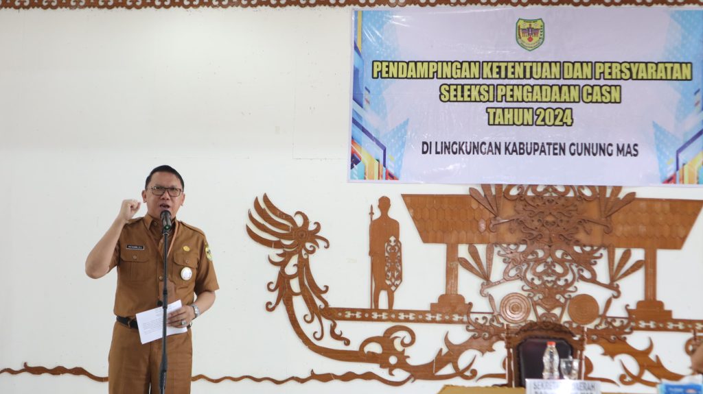 MMCGumas – Kuala Kurun – Sekretaris Daerah (Sekda) Gunung Mas (Gumas), Richard, didampingi Plt. Sekretaris Badan Kepegawaian dan Pengembangan Sumber Daya Manusia (BKPSDM), Novera Petrus Jaya, yang mana pada kesempatan tersebut mewakili Plt. Kepala BKPSDM, Kristening, menghadiri sekaligus membuka kegiatan Pendampingan Tenaga Non ASN tentang Ketentuan dan Persyaratan Seleksi Pengadaan CASN Tahun 2024 di Lingkungan Pemkab Gumas, bertempat di GPU Damang Batu, Selasa (20/08/2024).