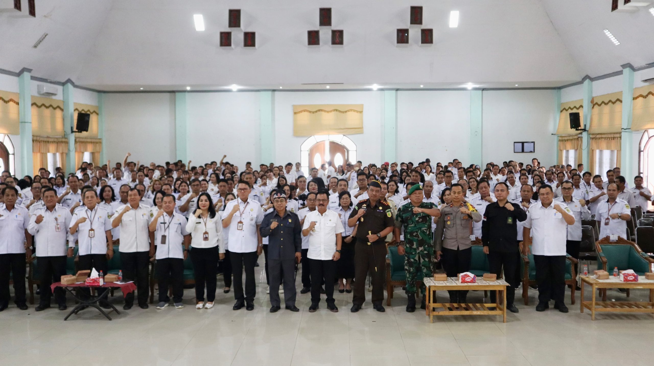Foto bersama : Pj. Bupati Gumas, besama unsur Forkopimda, Kepala OPD dan seluruh Pegawai Negeri Sipil setingkat Pejabat Eselon III dan Eselon IV.