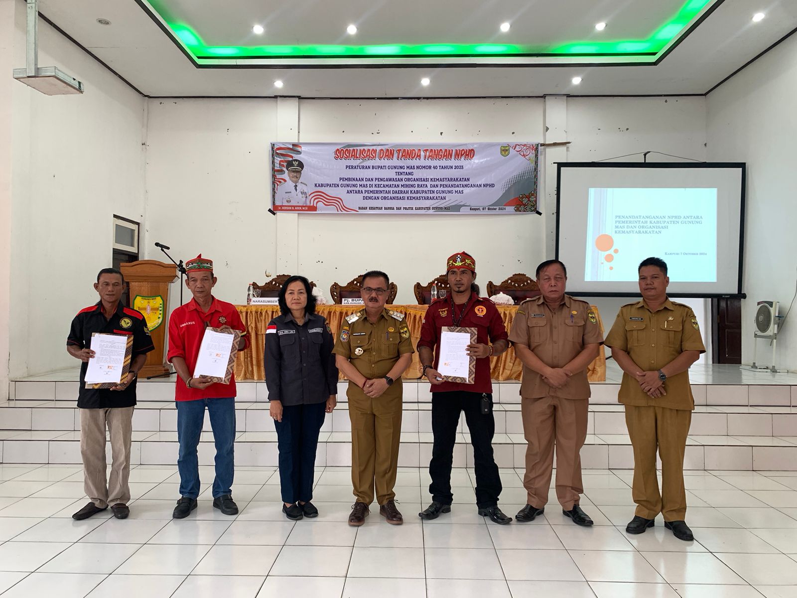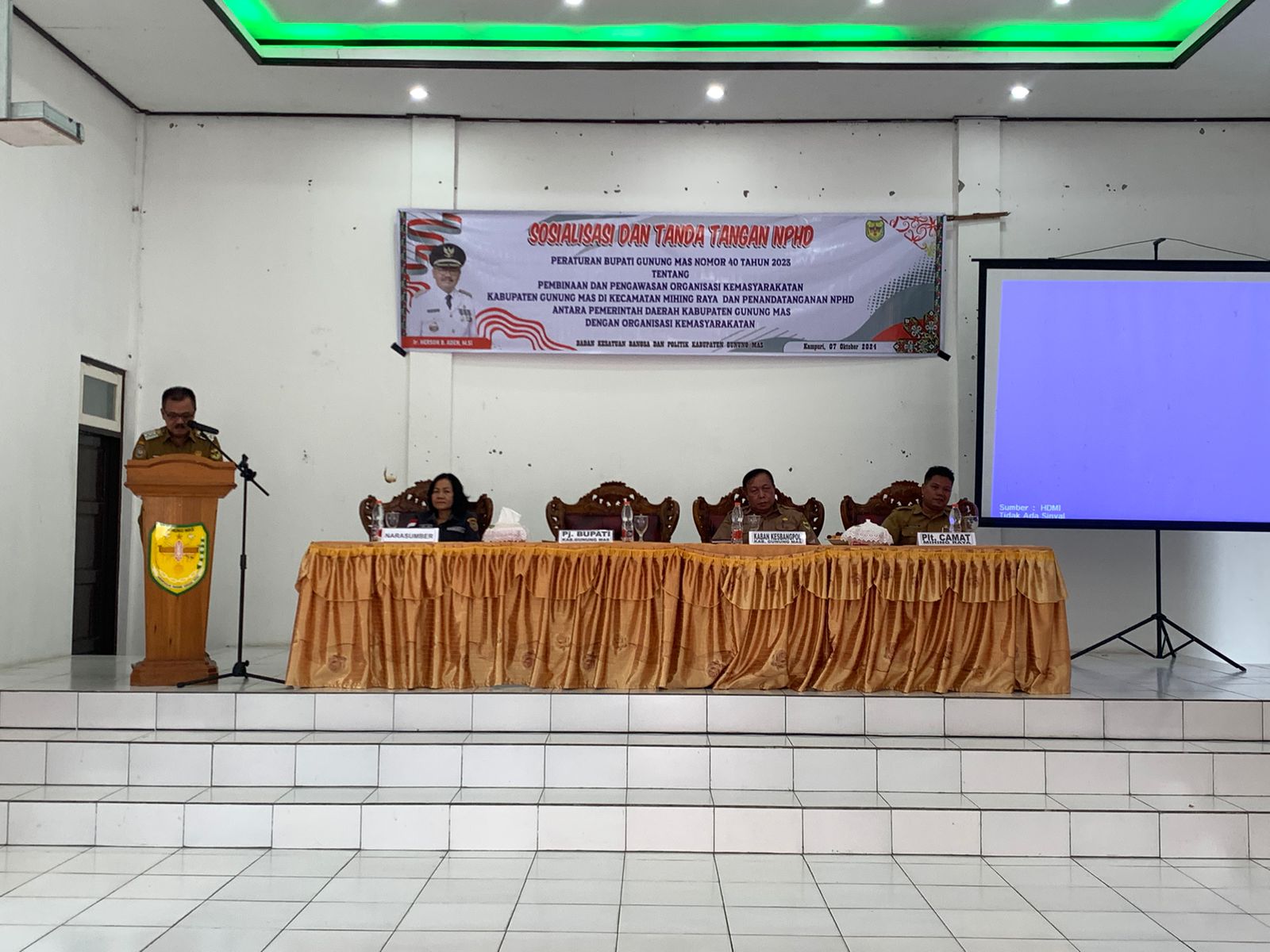 MMCGumas – Kuala Kurun – Pemerintah Kabupaten Gunung Mas (Gumas) melalui Badan Kesatuan Bangsa dan Politik (Kesbangpol), melaksanakan kegiatan Sosialisasi Pembinaan dan Pengawasan Organisasi Kemasyarakatan, yang merujuk pada Peraturan Bupati Gunung Mas Nomor 40 Tahun 2023 dan dilanjutkan dengan Penandatanganan Naskah Perjanjian Hibah Daerah (NPHD) antara Pemerintah Kabupaten Gunung Mas dengan Organisasi Kemasyarakatan. Kegiatan dipusatkan di aula Kantor Kecamatan Mihing Raya, Kelurahan Kampuri, pada Senin (7/10/2024).