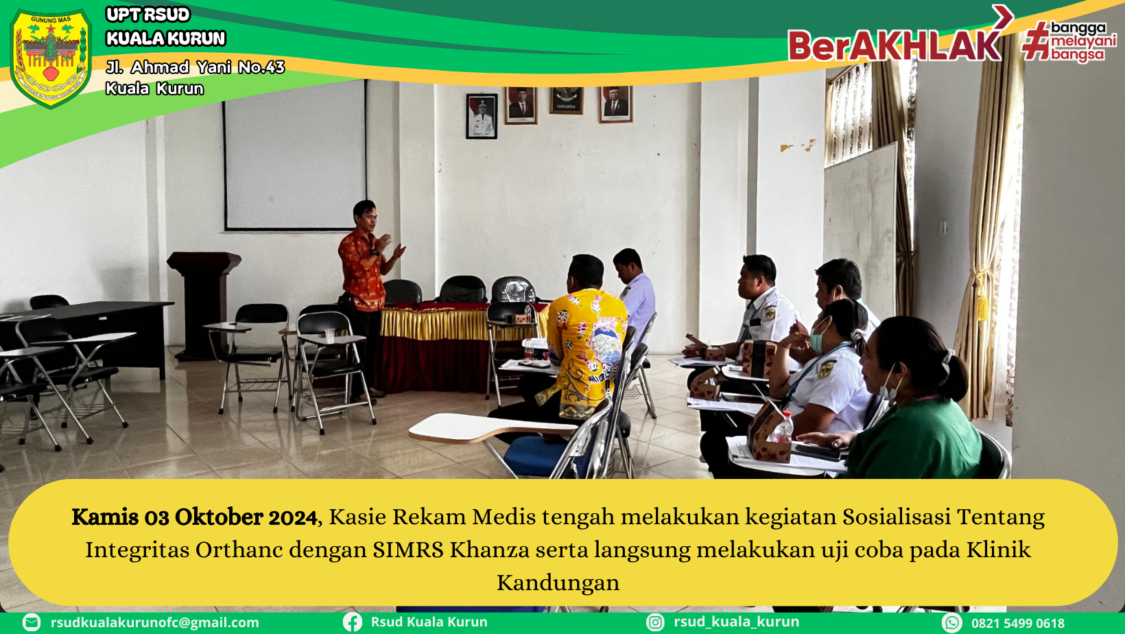 MMCGumas – Kuala Kurun – Kasie Rekam Medis RSUD Kuala Kurun mengadakan Sosialisasi dan Uji Coba Integritas Orthanc dengan SIMRS (Sistem Informasi Manajemen Rumah Sakit ). Kegiatan ini dihadiri oleh Kepala Ruangan, Kepala Unit, Kepala Instalasi dan Koordinator Ruangan serta Petugas Administrasi RSUD Kuala Kurun. Bertempat di Ruang Aula Lantai 2 RSUD Kuala Kurun, Kamis (3/10/2024)