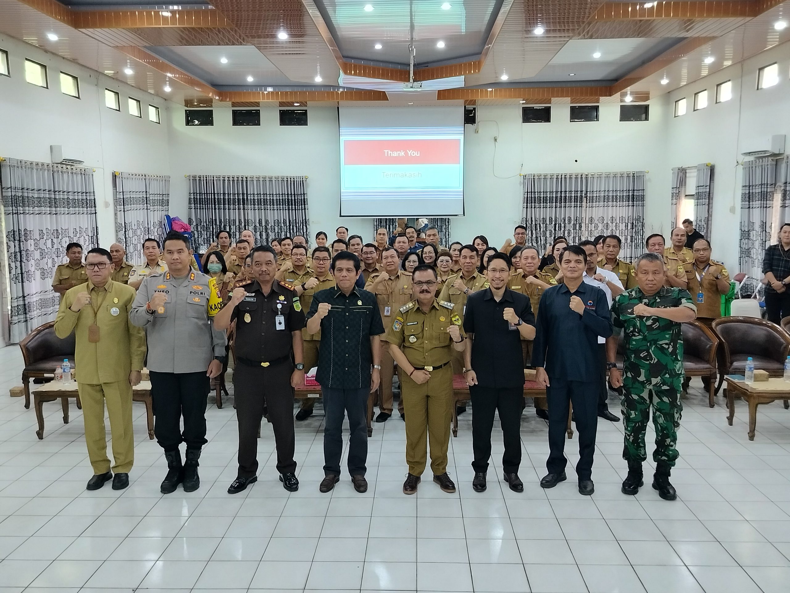 Foto bersama : PJ.Bupati Gumas, Ombudsman RI, Forkopimda dan Kepala Perangkat Daerah beserta Instansi Vertikal, di Aula Bapperida Gumas.