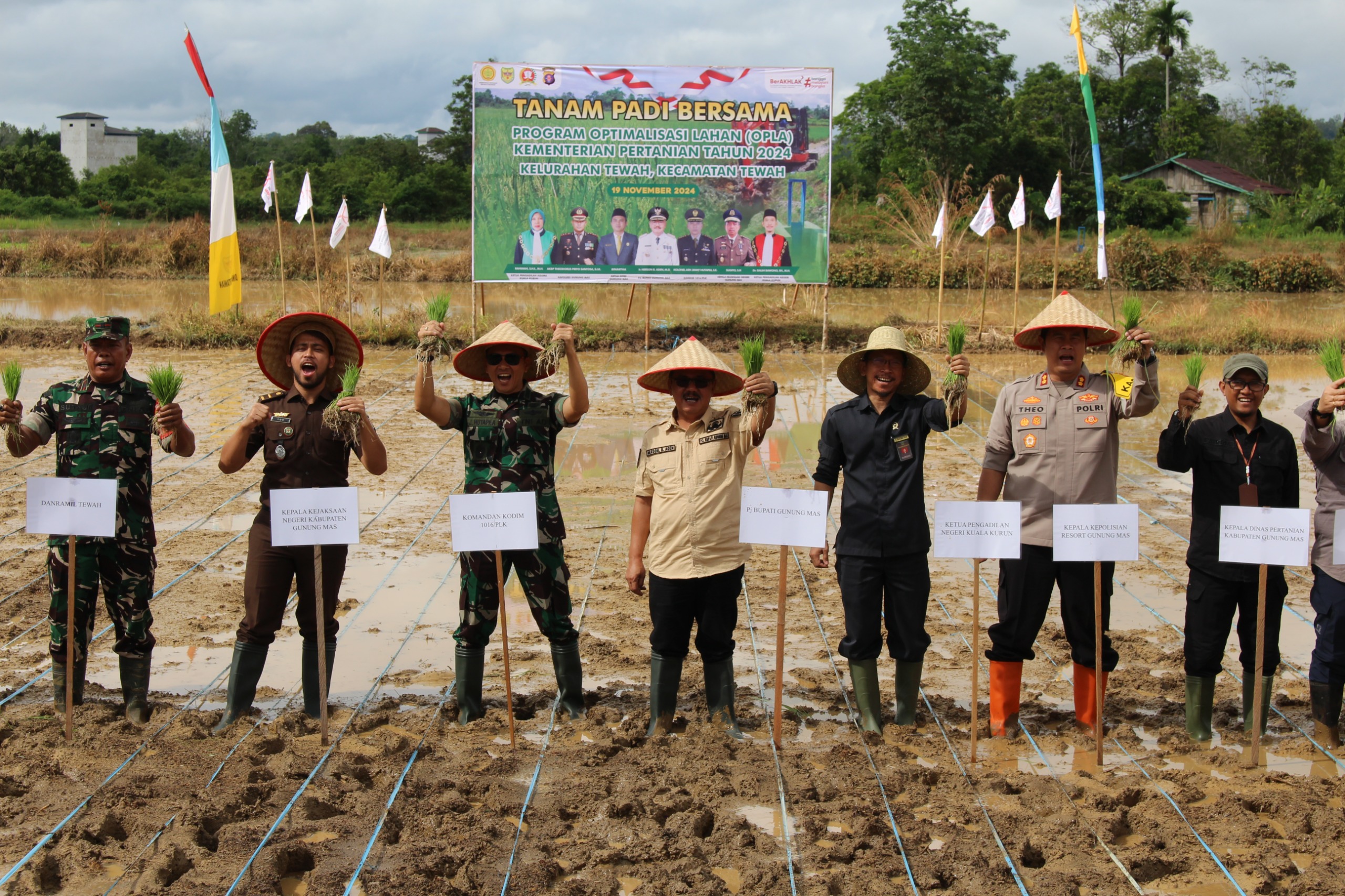 MMCGumas – Kuala Kurun – Penjabat (Pj) Bupati Gunung Mas (Gumas), Herson B. Aden, menghadiri acara Tanam Padi Bersama pada Program Optimalisasi Lahan (OPLA) Kementerian Pertanian Tahun Anggaran 2024, yang dilaksanakan di atas lahan Kelompok Tani Tangkalasa Kelurahan Tewah, Kecamatan Tewah, Selasa (20/11/2024).