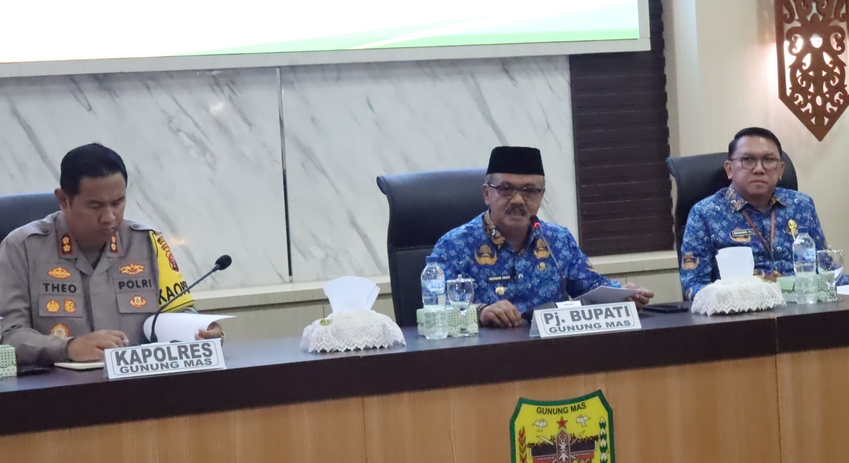 MMCGumas – Kuala Kurun – Penjabat (Pj) Bupati Gunung Mas (Gumas), Herson B. Aden, memimpin rapat koordinasi bersama Forum Koordinasi Pimpinan Daerah (Forkopimda) terkait pembentukan Satuan Tugas (Satgas) guna menindaklanjuti Surat Edaran Gubernur Kalimantan Tengah (Kalteng) mengenai larangan truk Perusahaan Besar Swasta (PBS) melintasi jalan umum Kuala Kurun – Palangka Raya. Rapat yang berlangsung di Aula Lantai I Kantor Bupati Gumas ini dihadiri oleh unsur Forkopimda, Sekda Gumas, dan Kepala OPD terkait.