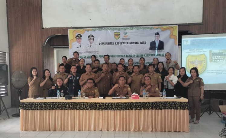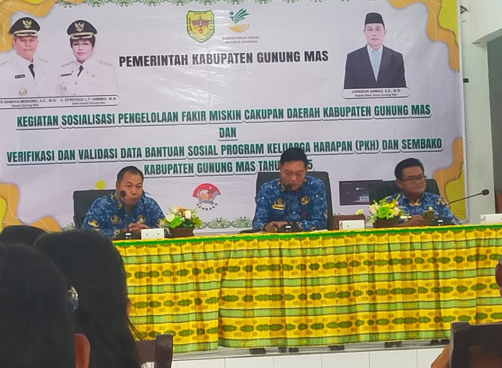 MMCGumas – Gunung Mas – Dalam rangka mendukung dan mensukseskan Program 100 Hari Bupati dan Wakil Bupati Gunung Mas (Gumas), Pemkab Gumas melalui Dinas Sosial melaksanakan kegiatan Sosialisasi Pengelolaan Data Fakir Miskin Cakupan Daerah Kabupaten Gunung Mas dan Verifikasi serta Validasi Data Bantuan Sosial PKH dan Sembako Tahun 2025 di Kec. Kurun, Senin (17/3/2025). kegiatan ini bertujuan untuk mengoptimalkan Data Tunggal Sosial Ekonomi Nasional (DTSEN) sebagai basis data utama guna memastikan bantuan sosial tepat sasaran.