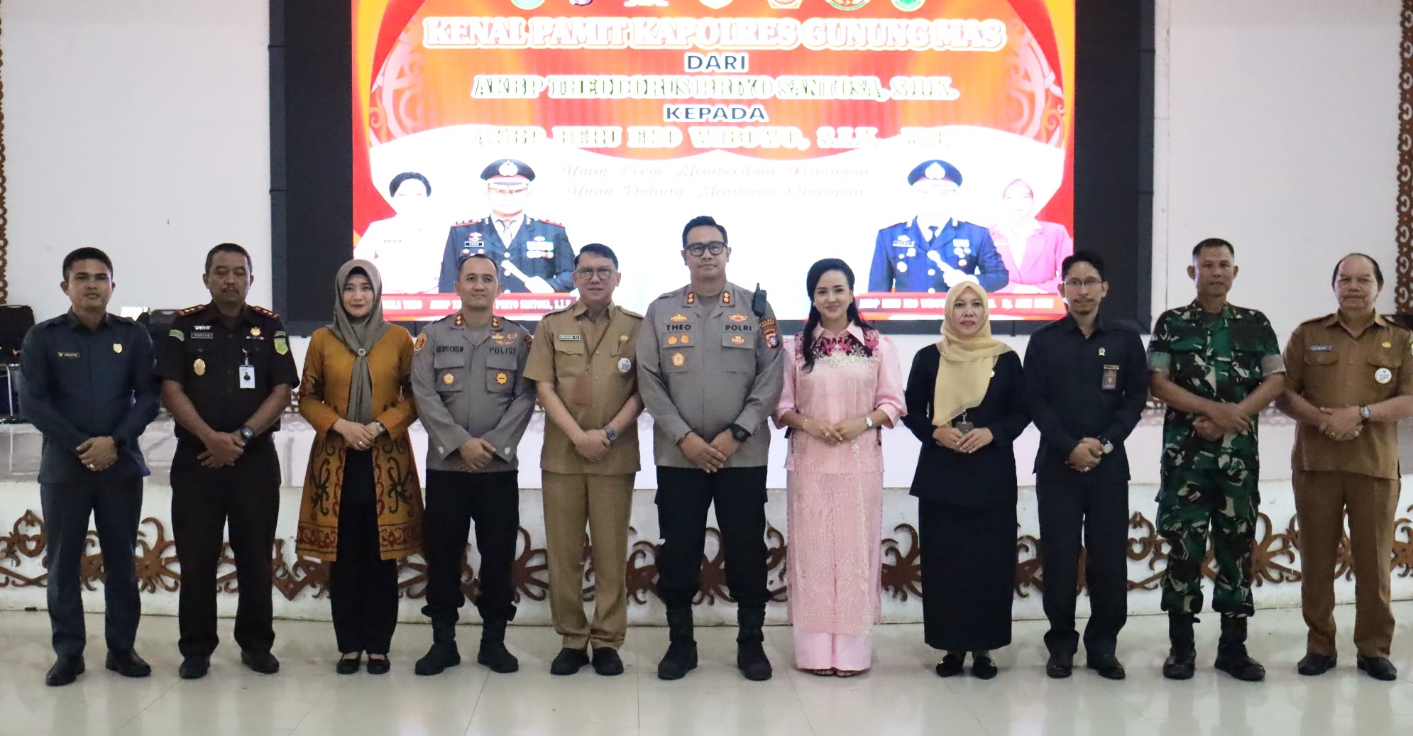 Foto Bersama : Sekda Gumas Richard, Kapolres baru, AKBP Heru Eko Wibowo, S.H., S.I.K., M.H., bersama AKBP Theodorus Priyo Santosa, S.I.K. dan Forkopimda Gumas serta Kepala Perangkat Daerah di Aula GPU Damang Batu, Selasa 15/4/2025.