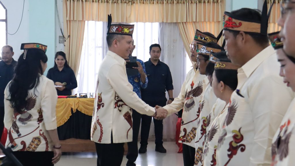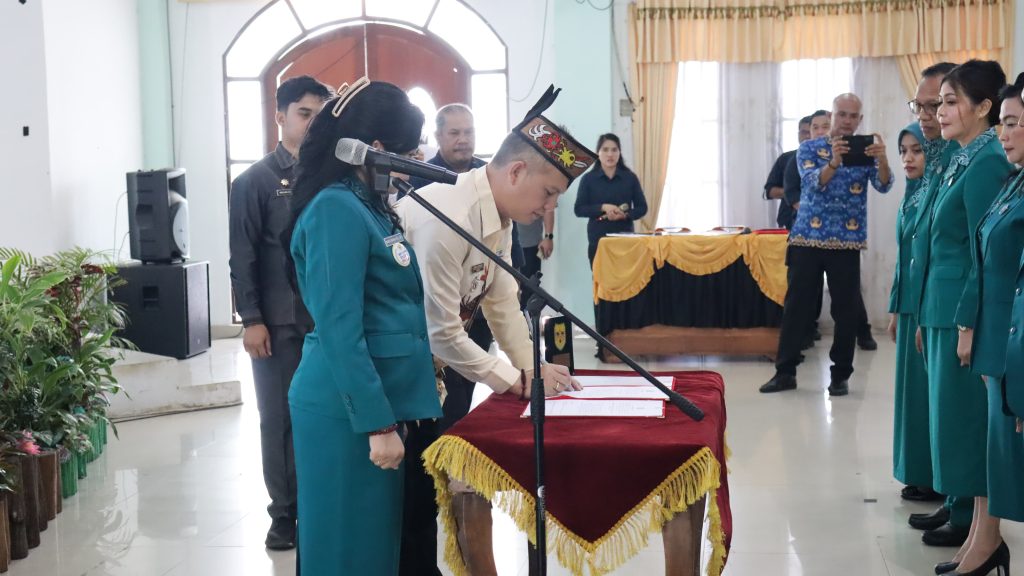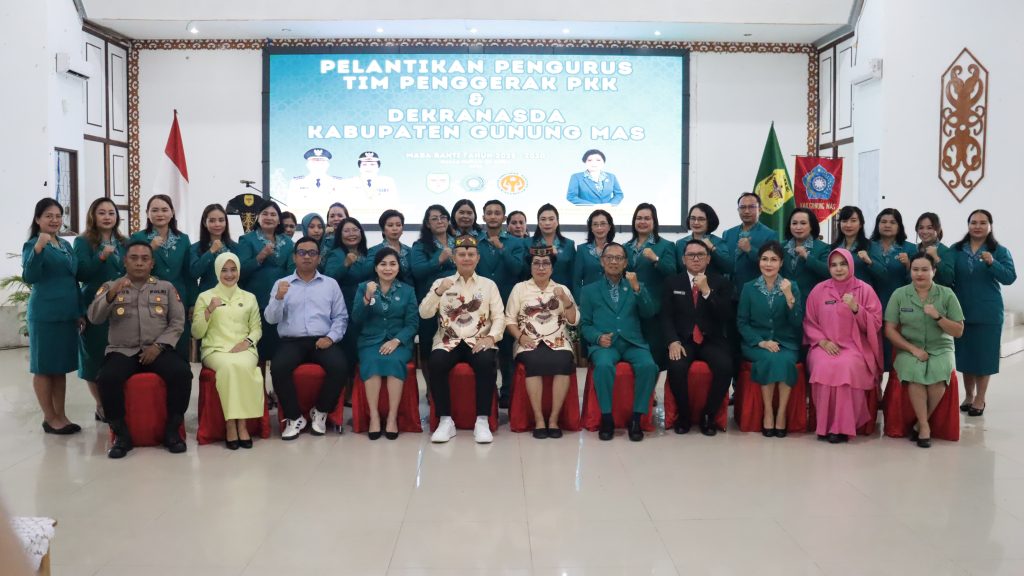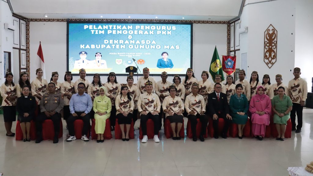 MMCGumas – Kuala Kurun – Bupati Gunung Mas (Gumas) Jaya Samaya Monong melantik Ketua Tim Penggerak (TP) PKK dan Dewan Kerajinan Nasional Daerah (Dekranasda) Kabupaten Gumas masa bakti 2025-2030 di Gedung Pertemuan Umum (GPU) Damang Batu, Jumat (25/4/2025).