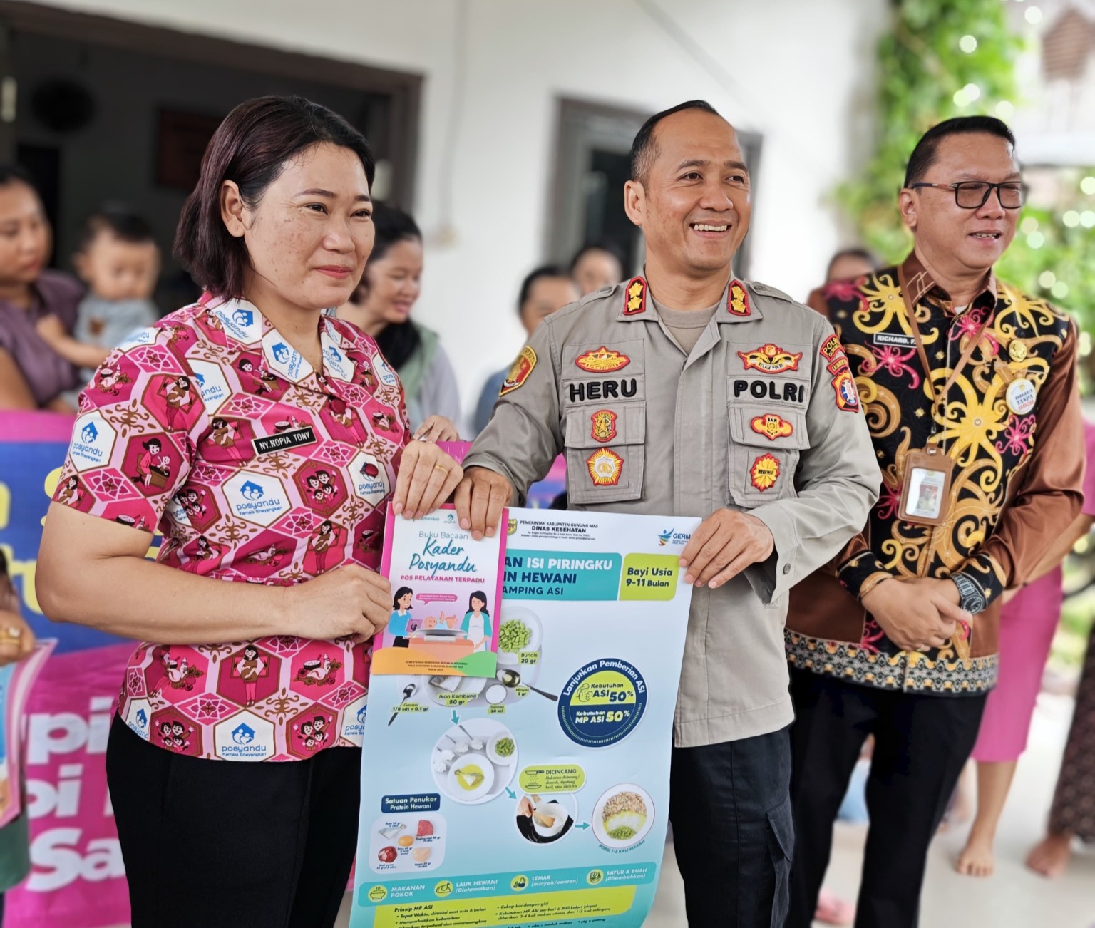 Foto : Kapolres Gunung Mas AKBP Heru Eko Wibowo bersama Sekretaris Daerah Richard, saat berinteraksi dengan ibu dan balita di Posyandu Kemala, Kamis 8/5/2025