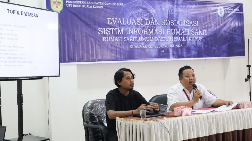 MMCGumas – Kuala Kurun – Dalam upaya meningkatkan kualitas layanan kesehatan, UPT (Unit Pelayanan Teknis) Rumah Sakit Umum Daerah (RSUD) Kuala Kurun menggelar kegiatan Evaluasi, Sosialisasi, dan Pelatihan Sistem Informasi Manajemen Rumah Sakit (SIMRS) Khanza, yang berlangsung di Aula RSUD Kuala Kurun, Rabu (25/6/2025).