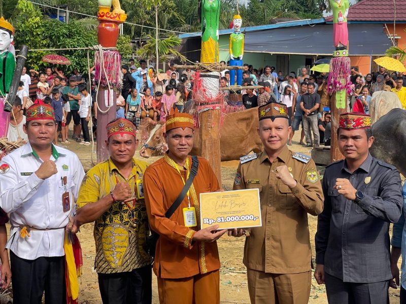 Penyerahan bantuan dilakukan langsung oleh Bupati dan disaksikan oleh Ketua DPRD Gunung Mas, Binartha, Kepala Dinas Kebudayaan dan Pariwisata, Hansli Gonak, tokoh adat, tokoh masyarakat, serta Plt. Camat Rungan Barat beserta jajaran perangkat kecamatan.