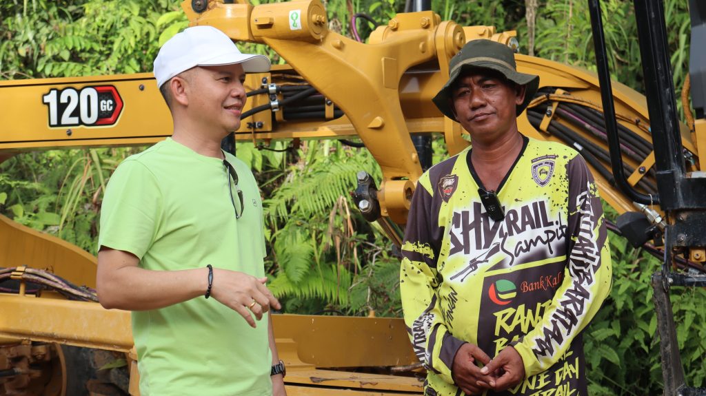 Foto : Bupati Gunung Mas Jaya S. Monong, didampingi Sekretaris Dinas PU, Bambang Jaya, saat berbincang bersama operator pelaksana perbaikan jalan (Miri Manasa), Minggu, 27/7/2025.