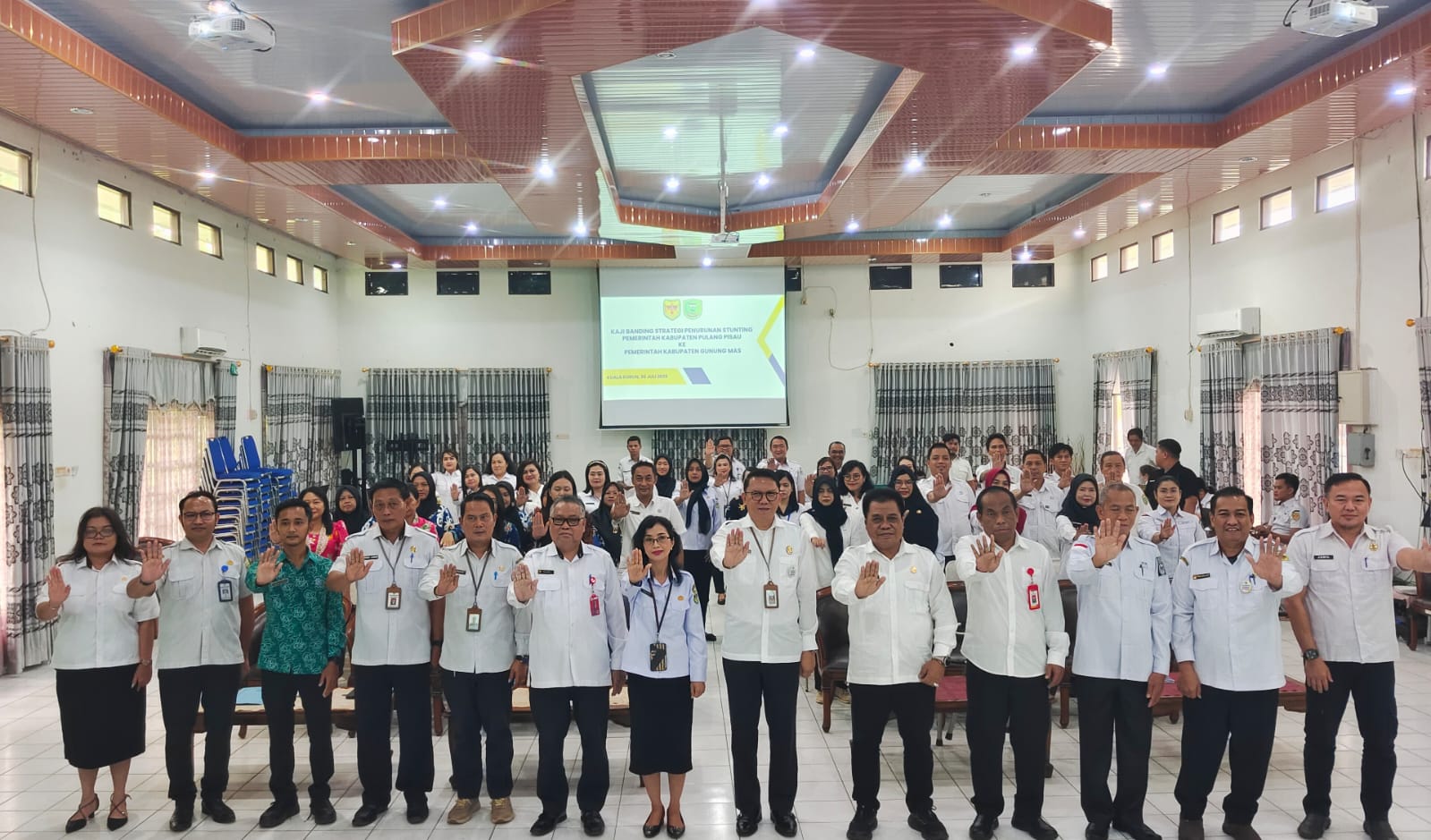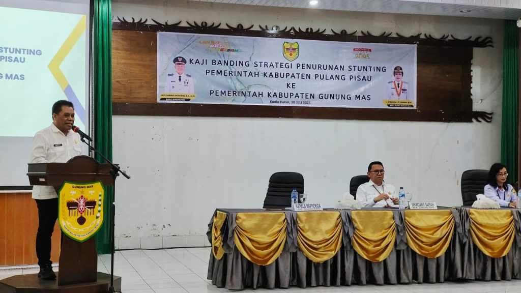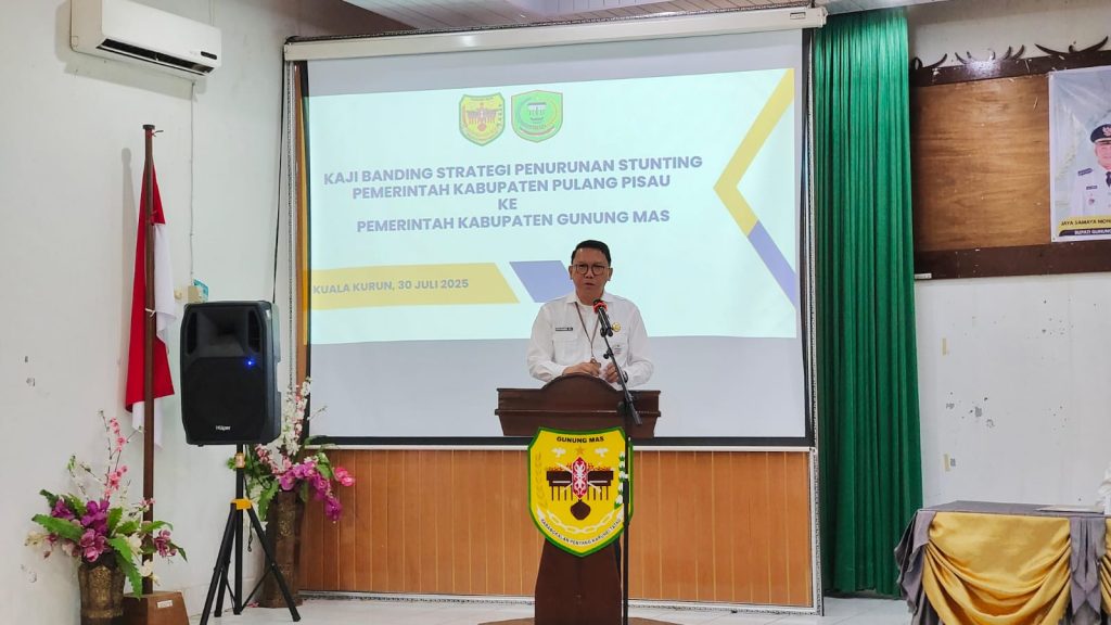 MMCGumas – Kuala Kurun – Pemerintah Kabupaten Gunung Mas menerima kunjungan rombongan Tim Percepatan Penurunan Stunting (TPPS) Kabupaten Pulang Pisau dalam kegiatan Kaji Tiru Strategi Penurunan Stunting ke Tim Percepatan Pencegahan dan Penangaan Stunting (TP3S) Kabupaten Gunung Mas, yang dilaksanakan di Aula Bapperida Gunung Mas, Rabu (30/7/2025).
