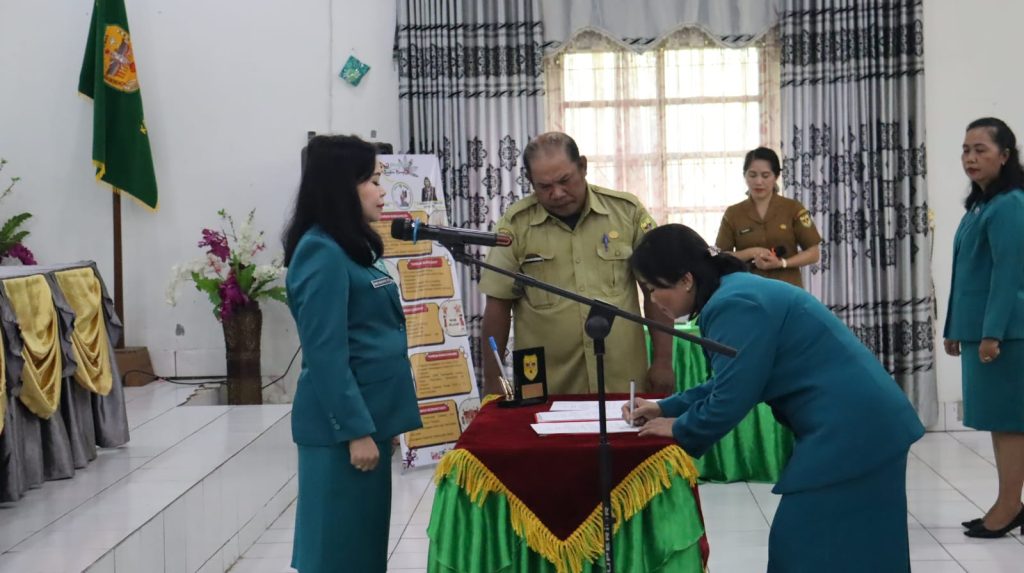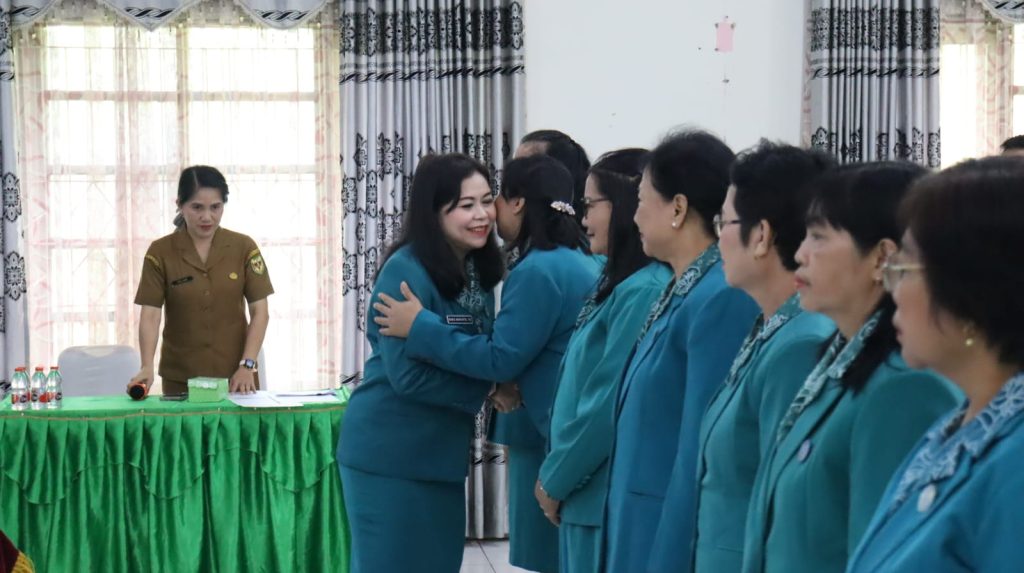 Foto Diskominfosantik : Ketua TP – PKK, selaku Ketua Tim Pembina Posyandu Kab. Gunung Mas, Mimie Mariatie Jaya S. Monong, saat mengukuhkan Ketua Pembina Posyandu Kecamatan, di aula Bapperida Gumas, Selasa 19/8/2025